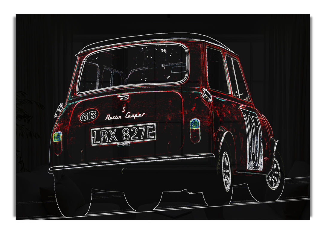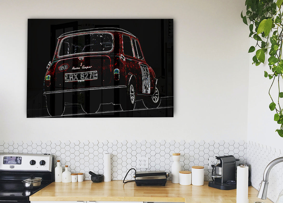 Acryldruck der Rückseite des Mini Cooper, UV-gedruckt auf 5 mm dickes Acrylglas. Wird mit allem geliefert, was Sie zum Aufhängen an die Wand brauchen.