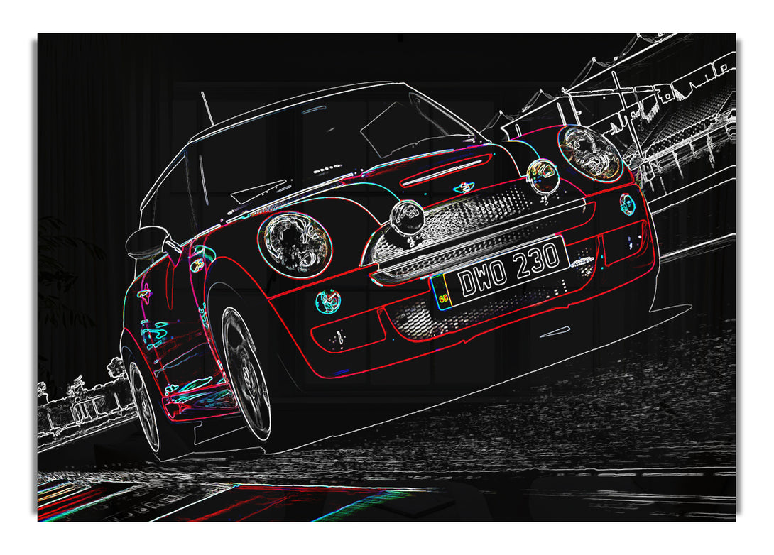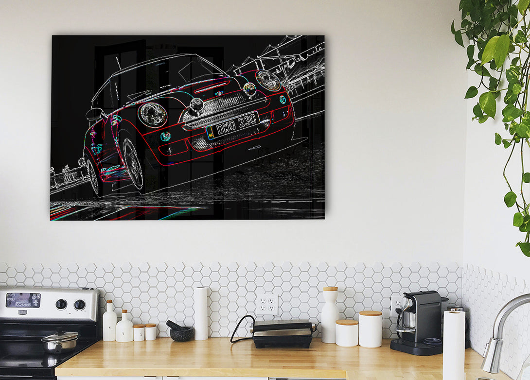 Mini Cooper Track Day-Acryldruck, UV-gedruckt auf 5 mm dickes Acrylglas. Wird mit allem geliefert, was Sie zum Aufhängen an die Wand brauchen.