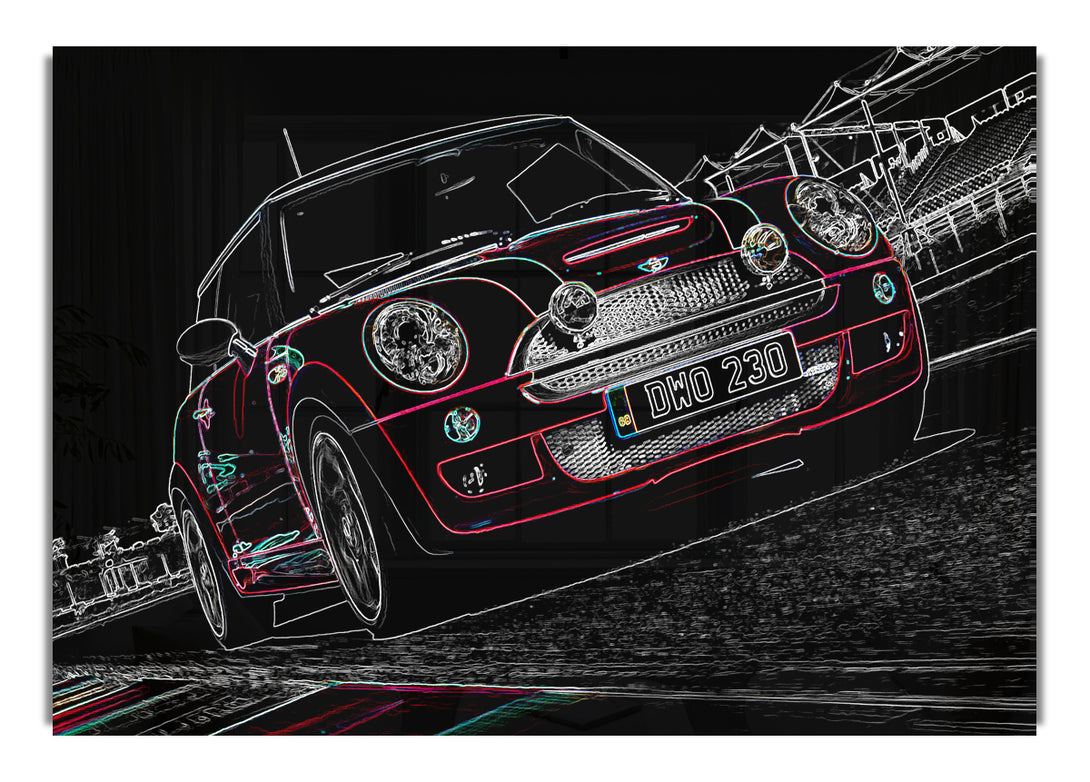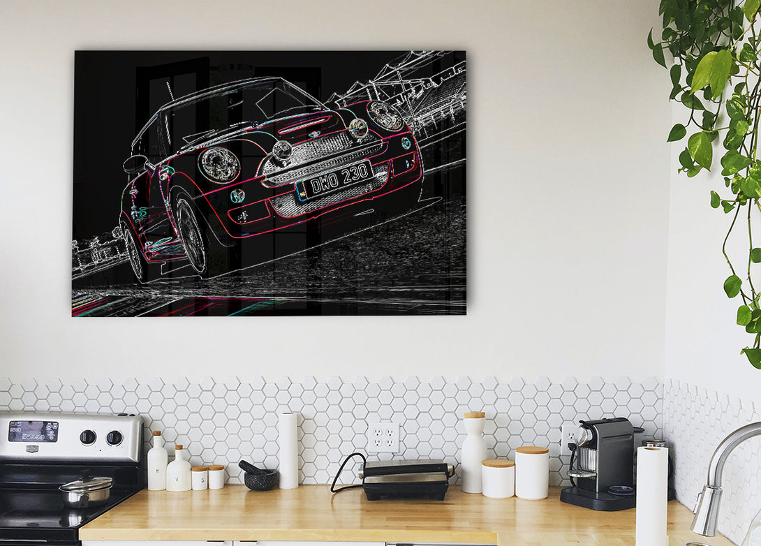 Mini Cooper Track Day Transport Acryldruck auf Leinwand, UV-gedruckt auf 5 mm dickes Acrylglas. Wird mit allem geliefert, was Sie zum Aufhängen an die Wand brauchen.