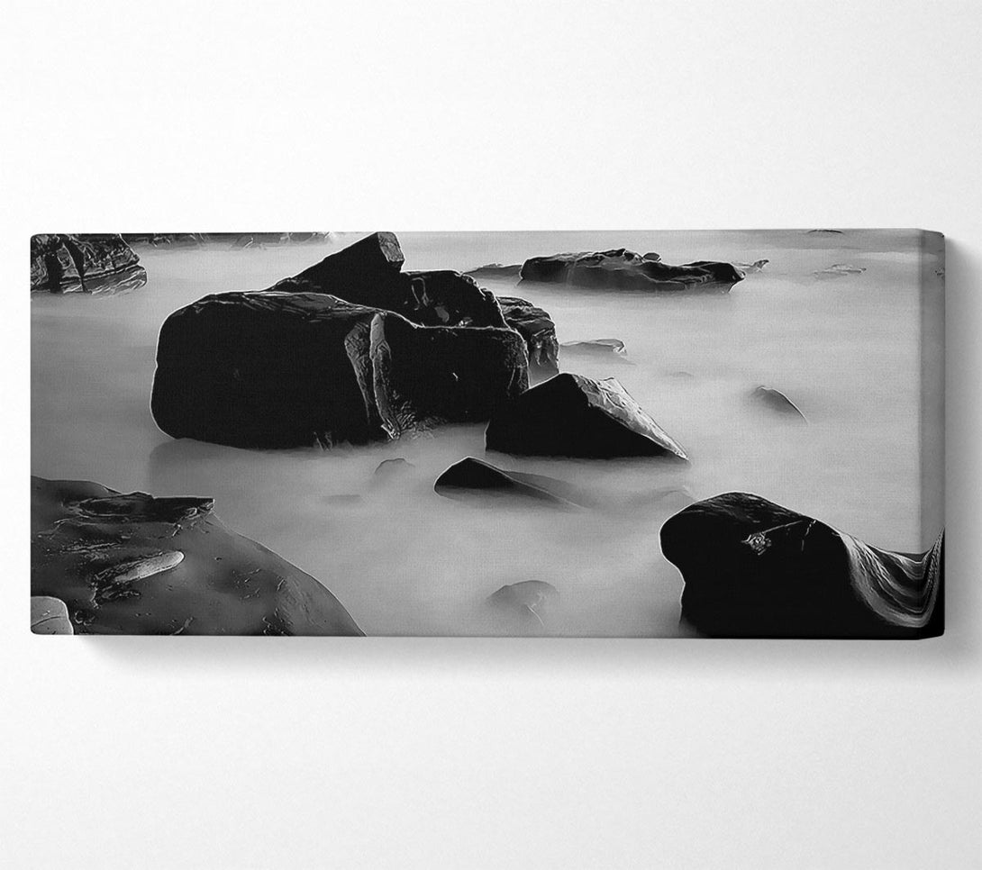 Schwarzweiße Leinwand mit neblig-ruhigen Ozeanfelsen, gedruckt auf beschichteter Polyester-Leinwand. Auf einem 44 mm großen Kastenrahmen montiert, fertig zum Aufhängen.