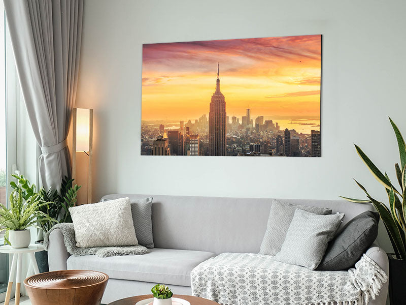 Misty Empire State Building Gedruckt auf gebürstetem Aluminium-Dibond. Eine moderne Art, Kunst zu präsentieren und leicht zu pflegen.