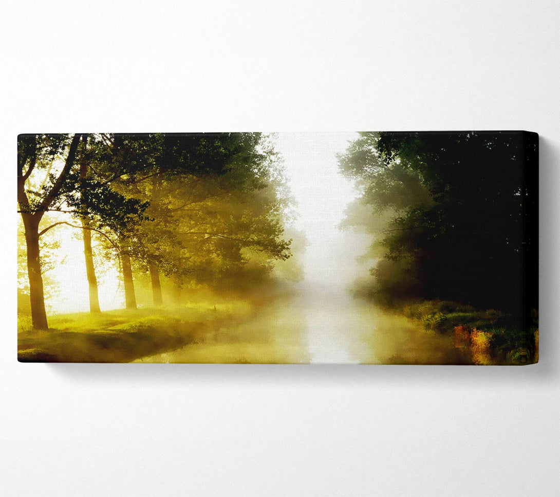 Leinwandbild „Misty Morning Lake“, gedruckt auf beschichteter Polyester-Leinwand. Auf einem 44 mm großen Kastenrahmen montiert, fertig zum Aufhängen.