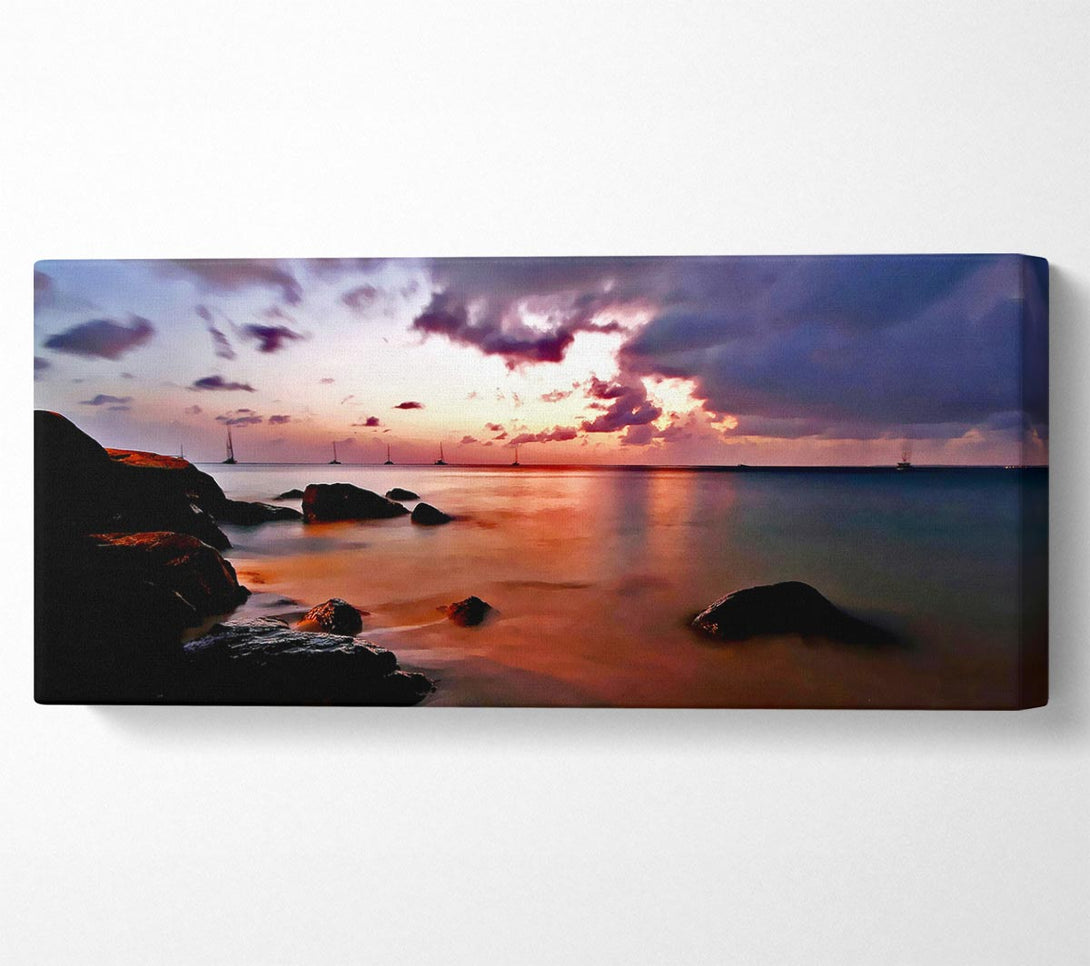 Leinwandbild „Misty Peach Ocean“, gedruckt auf beschichteter Polyester-Leinwand. Auf einem 44 mm großen Kastenrahmen montiert, fertig zum Aufhängen.