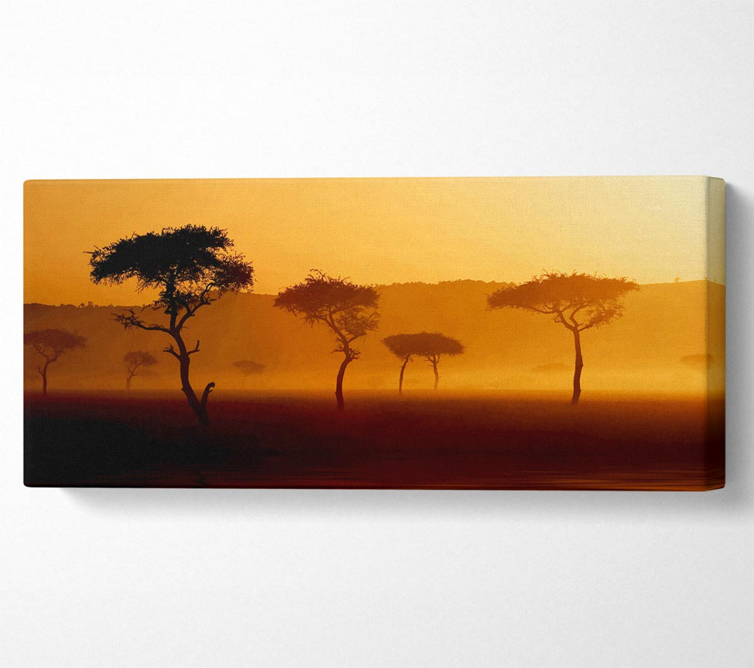 Leinwandbild „Misty Sunrise Lake“, gedruckt auf beschichteter Polyester-Leinwand. Auf einem 44 mm großen Kastenrahmen montiert, fertig zum Aufhängen.