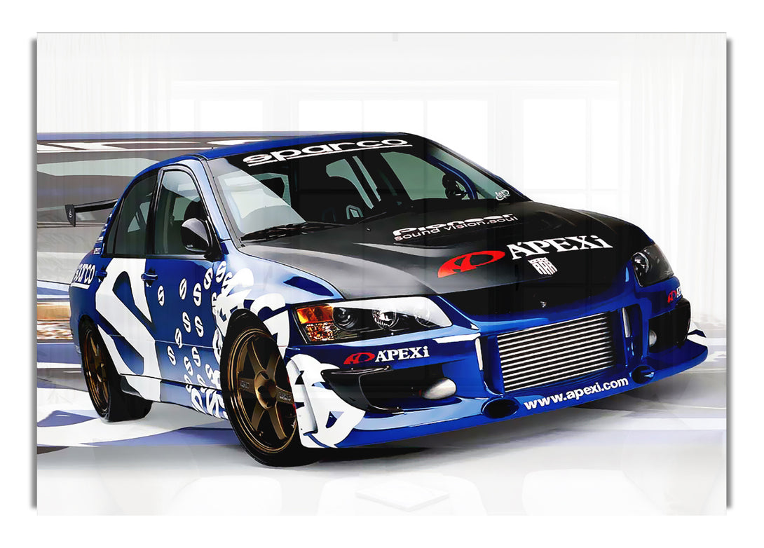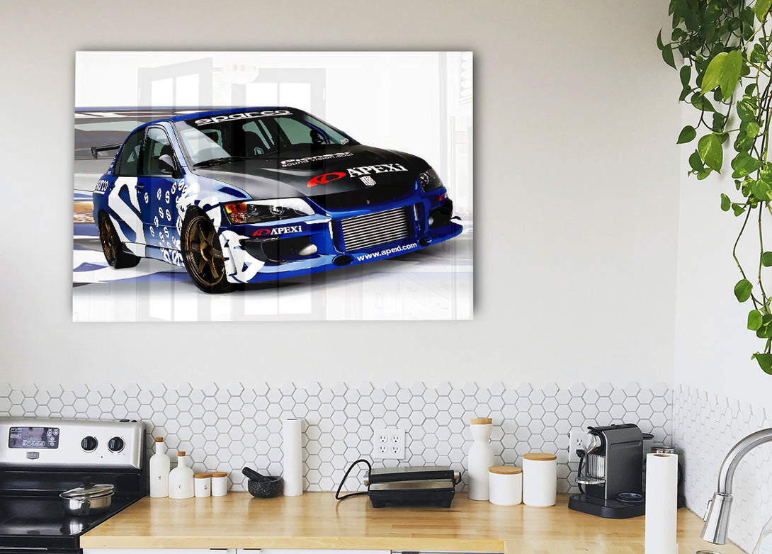 Mitsubishi Evo-Acryldruck, UV-gedruckt auf 5 mm dickes Acrylglas. Wird mit allem geliefert, was Sie zum Aufhängen an die Wand benötigen.