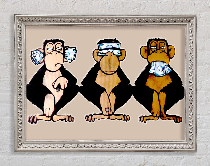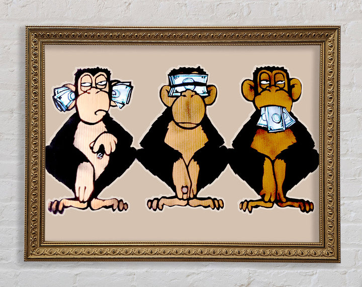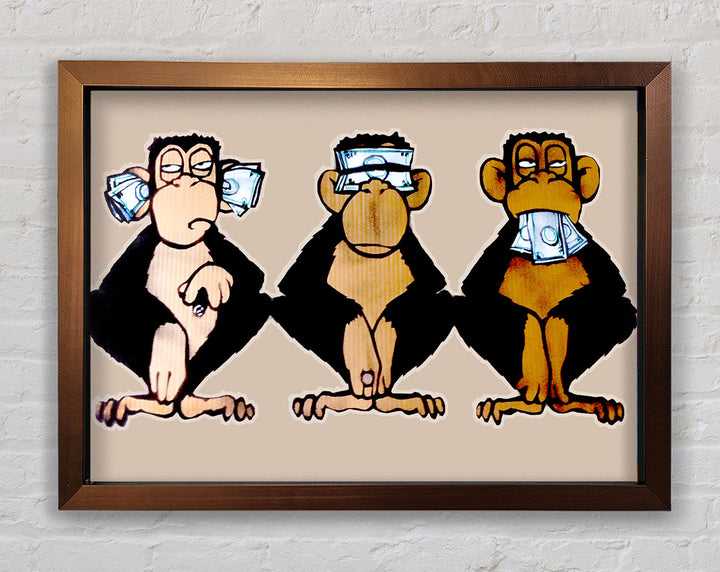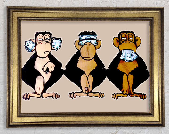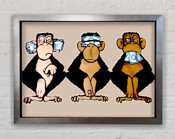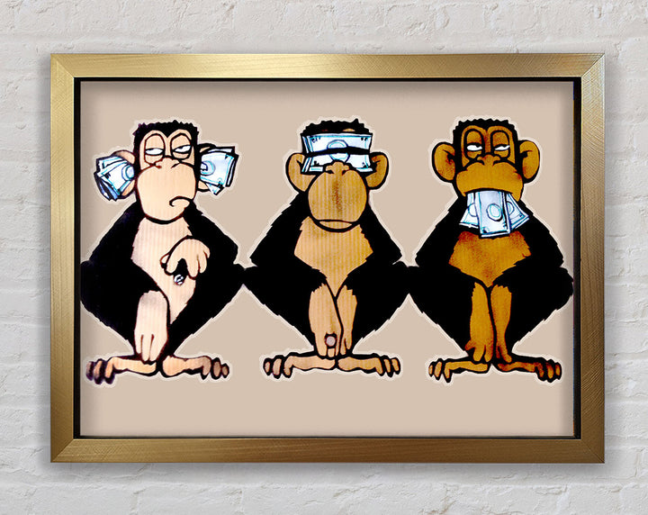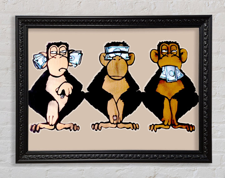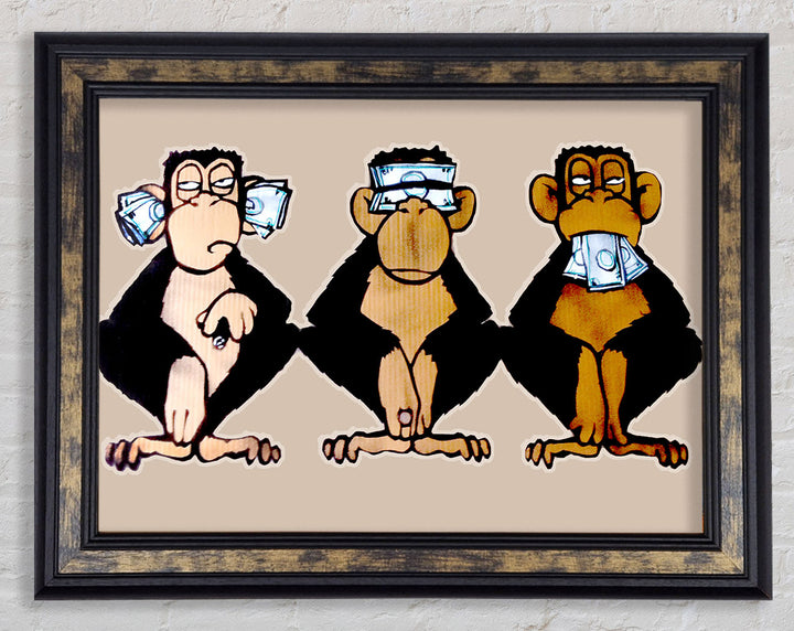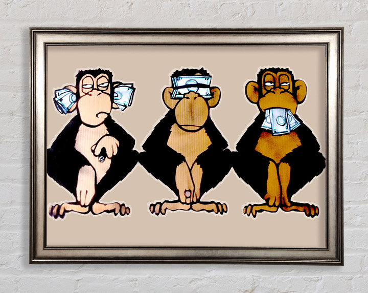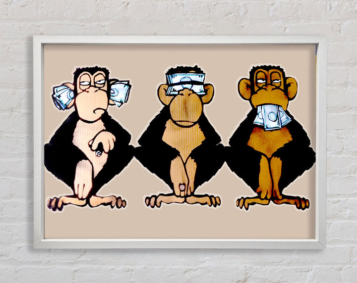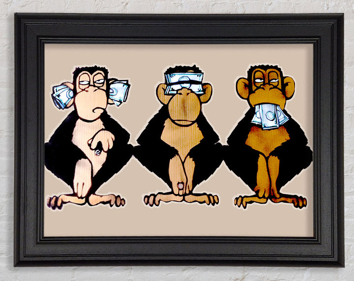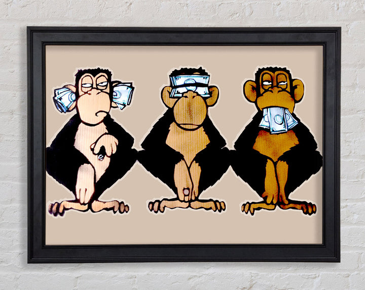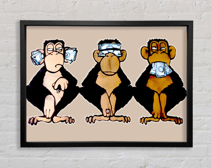 Gerahmter Druck „Money Monkeys Wise“, erhältlich in mehreren Rahmenfarben. Fertig zum Aufhängen aus der Schachtel und handgefertigt im Vereinigten Königreich.