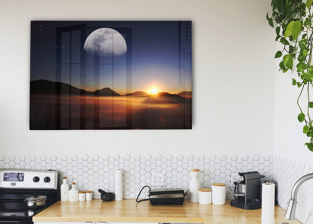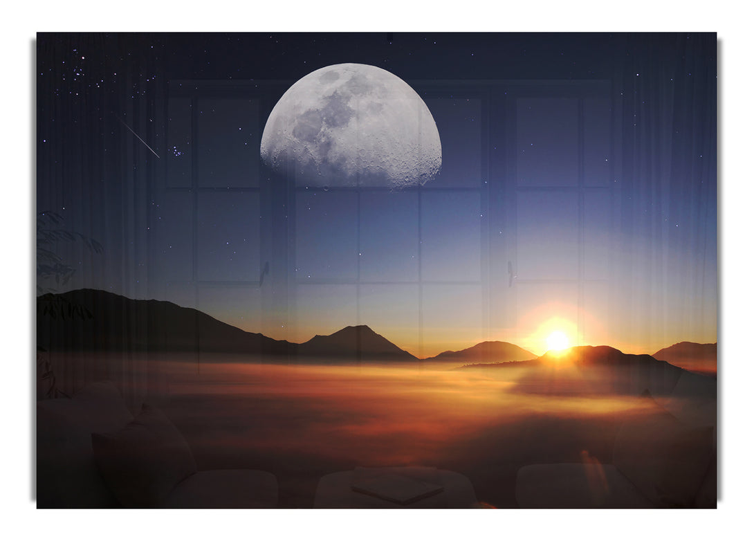 Acryldruck „Mond über dem Berg, Sonnenuntergang“, UV-gedruckt auf 5 mm dickes Acrylglas. Wird mit allem geliefert, was Sie zum Aufhängen an Ihre Wand benötigen.