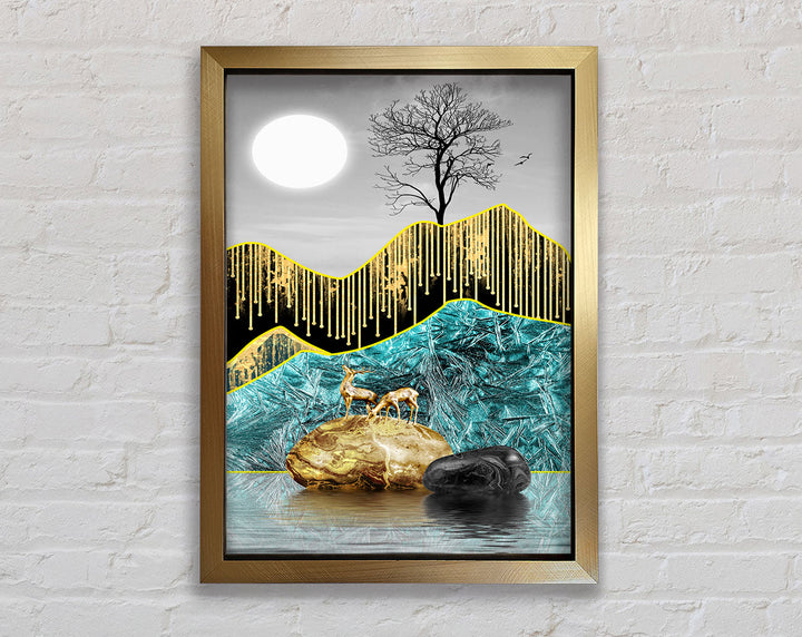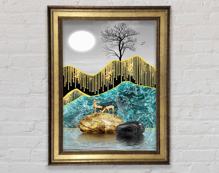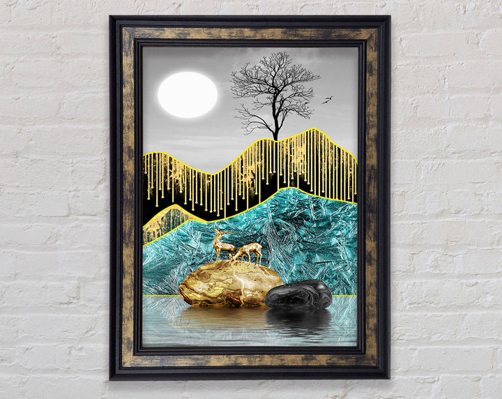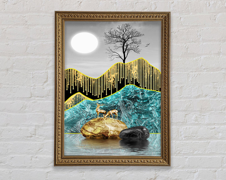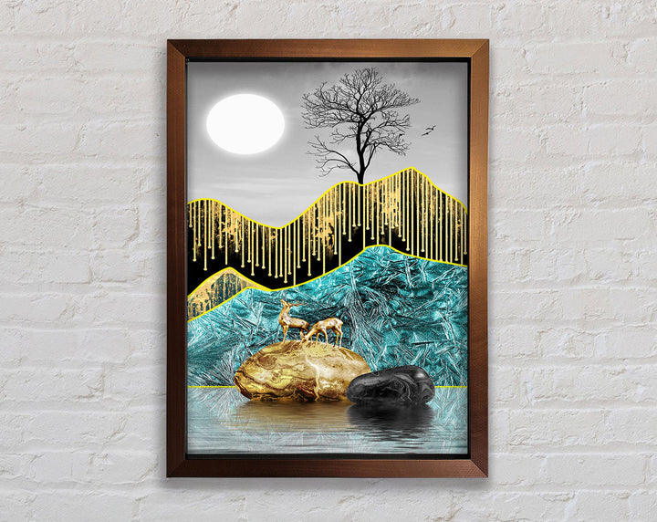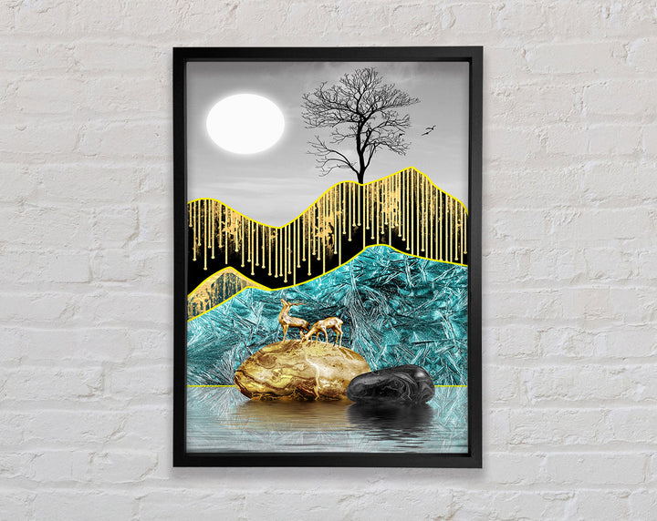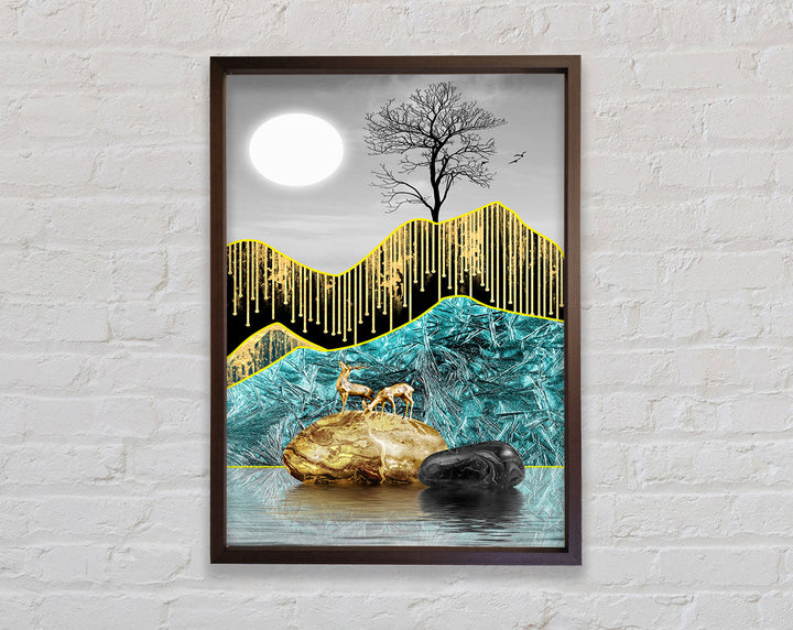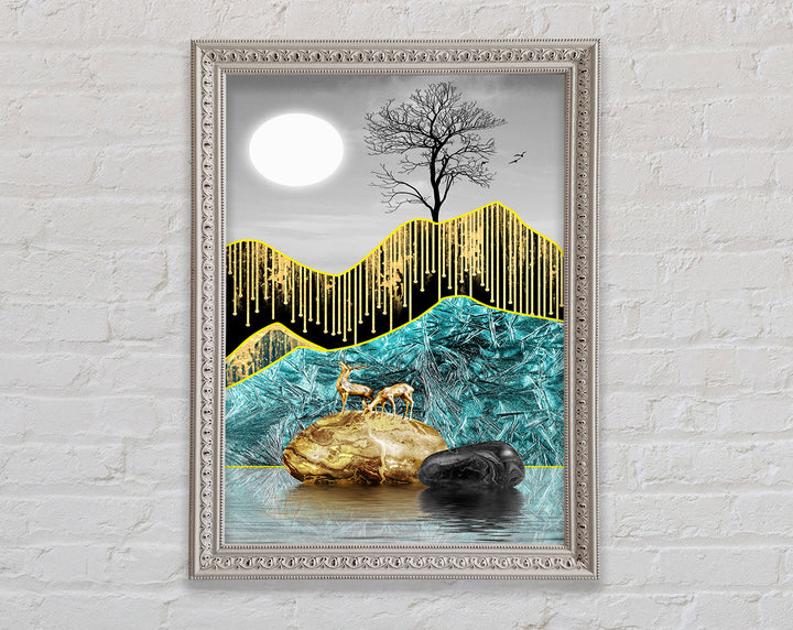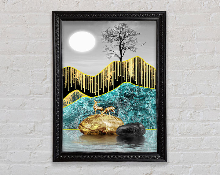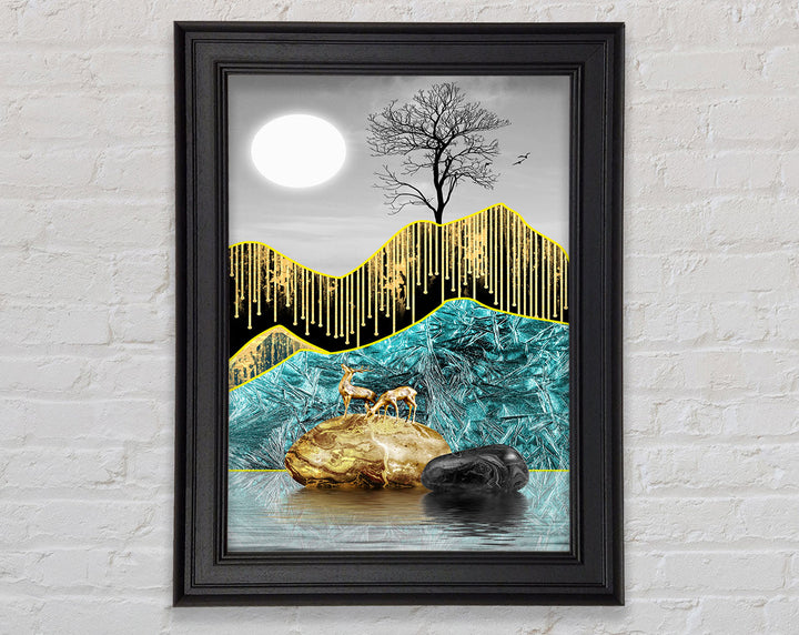 Introducing the stunning Moonlight Deer Rocks Framed Print, a perfect addition to elevate your home decor. This exquisite piece of framed art captures a serene night scene with majestic deer standing on rocky terrain under a moonlit sky. Available in six sizes, from small to oversized, it can fit any space in your home or office. Choose from a variety of colors to match your personal style and interior design. Each print is handmade in the United Kingdom with meticulous attention to detail, ensuring high quality and durability. Ready to hang, this framed art makes decorating effortless and adds a touch of elegance to any room.
