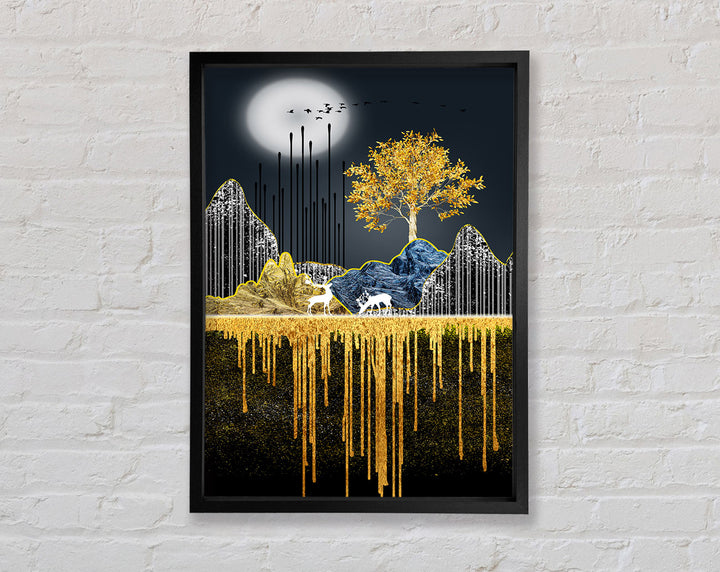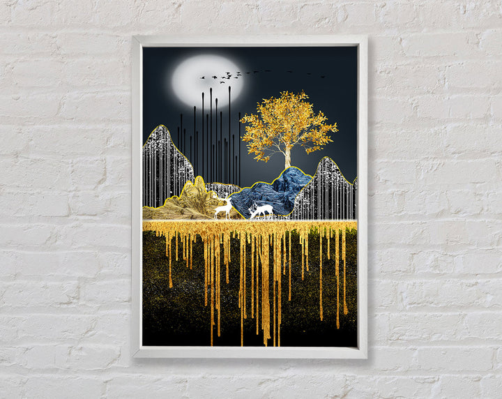 Introducing the Moonlit Gold Tree Framed Print, a stunning piece of framed art that will elevate any space. This beautiful print showcases a majestic tree bathed in moonlight, with golden hues adding a touch of elegance. Available in six sizes, ranging from small to oversized, it fits perfectly in any room, whether it's your living room, bedroom, or office.