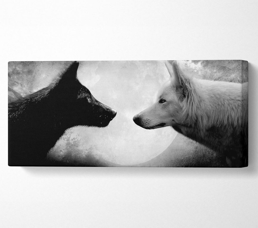 Leinwandbild „Moonlit Wolves“, gedruckt auf beschichteter Polyester-Leinwand. Auf einem 44 mm großen Kastenrahmen montiert, fertig zum Aufhängen.