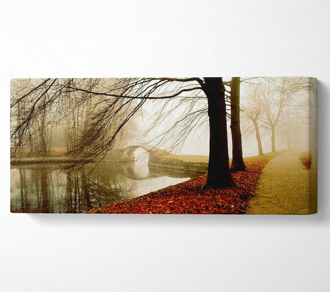 Leinwandbild „Morning Mist River Walk“, gedruckt auf beschichteter Polyester-Leinwand. Auf einem 44 mm großen Kastenrahmen montiert, fertig zum Aufhängen.