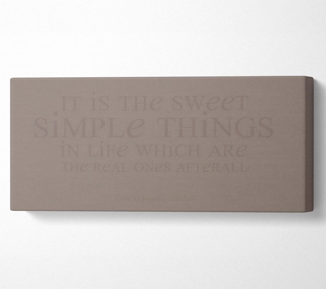 Motivationszitat „It Is The Sweet Simple Things“ von Laura Wilder. Beige Leinwand, gedruckt auf beschichteter Polyester-Leinwand. Auf einem 44 mm breiten Kastenrahmen montiert, fertig zum Aufhängen.