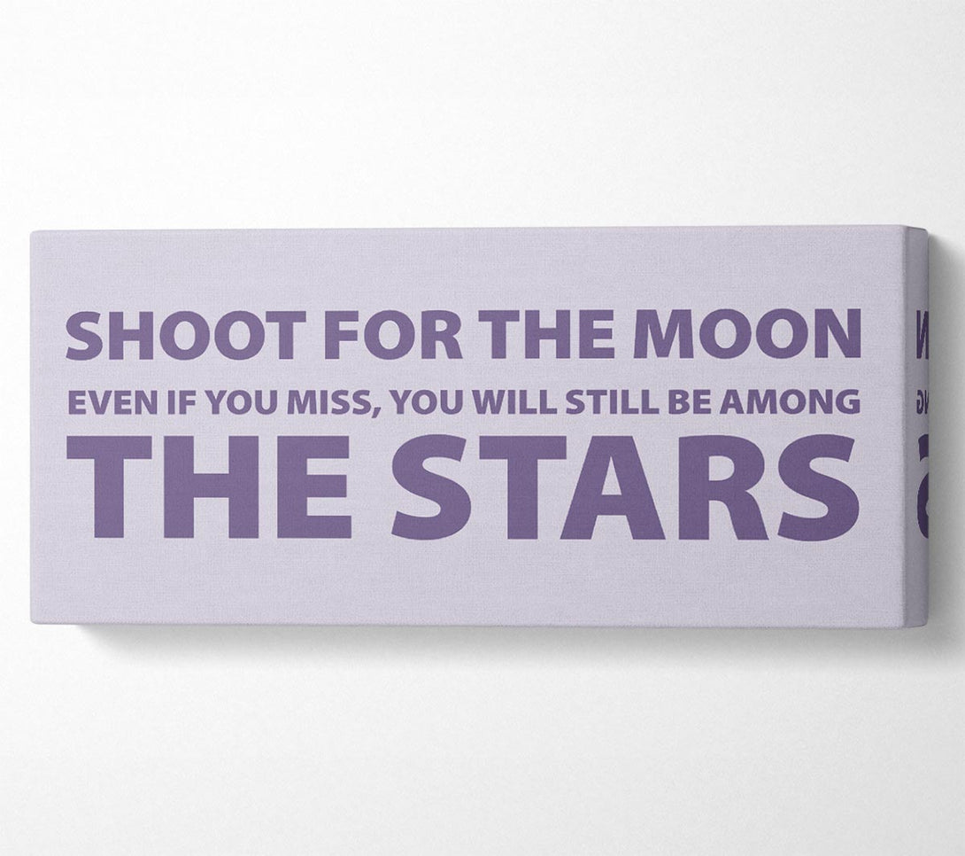 Motivierendes Zitat „Shoot For The Moon“ auf lila Leinwand, gedruckt auf beschichteter Polyester-Leinwand. Auf einem 44 mm großen Kastenrahmen montiert, fertig zum Aufhängen.