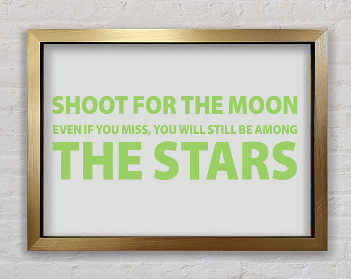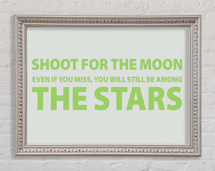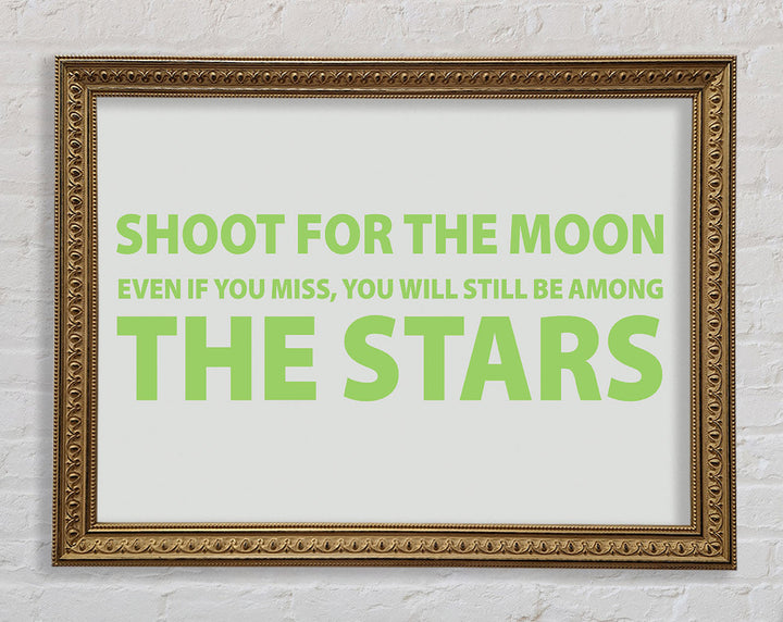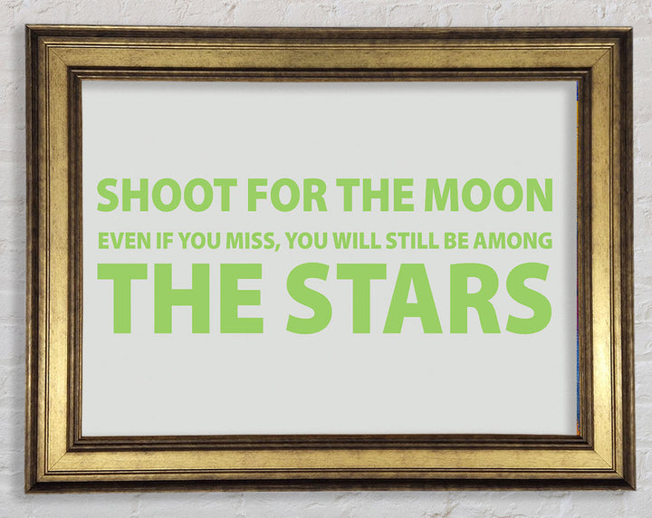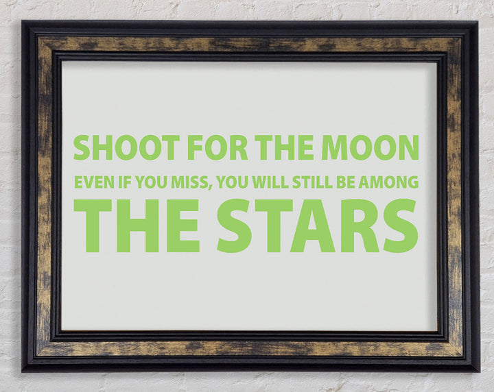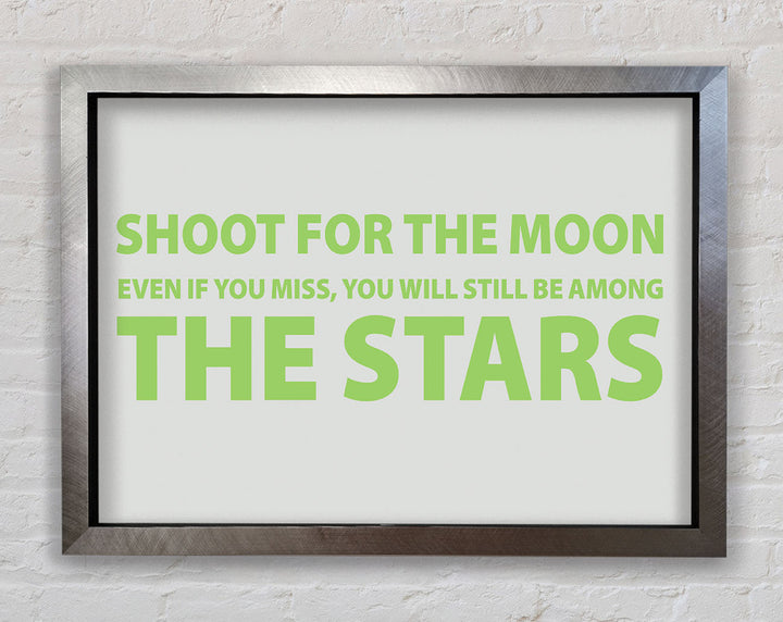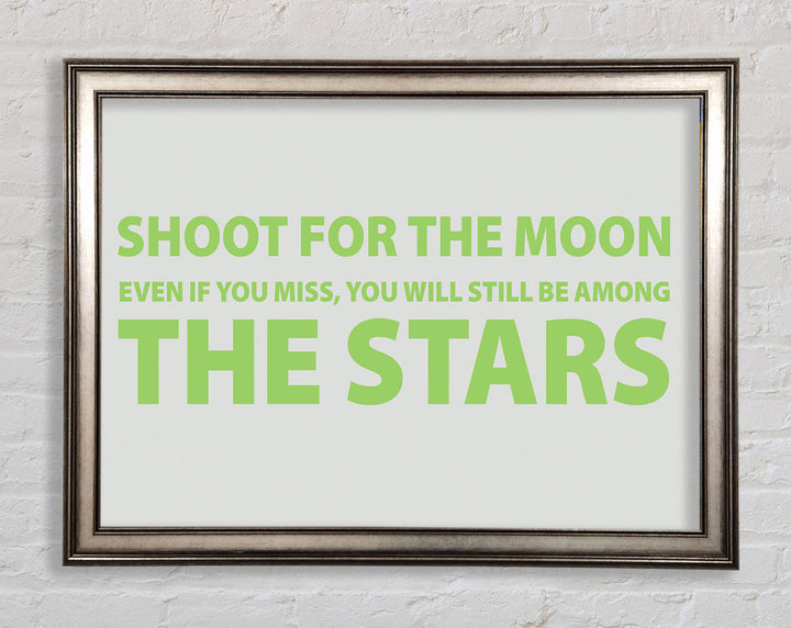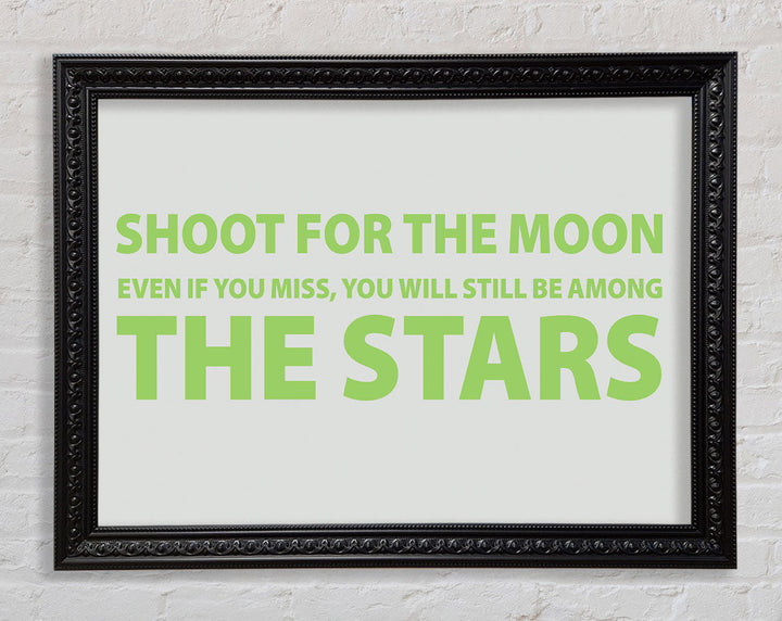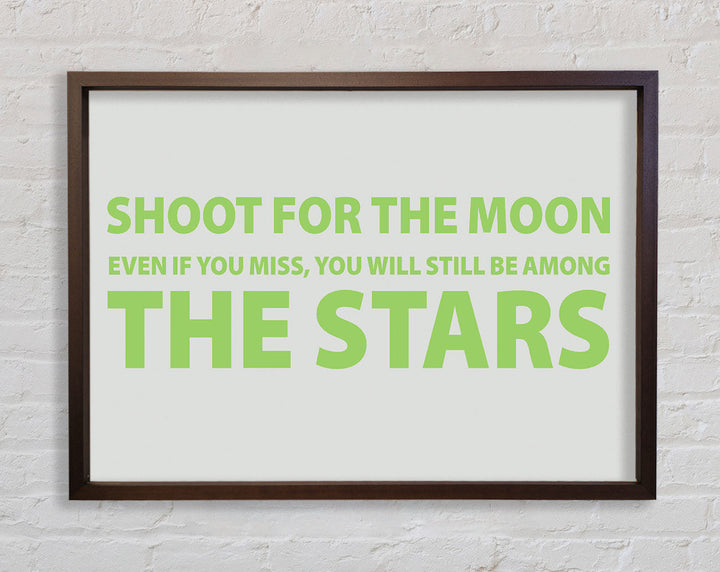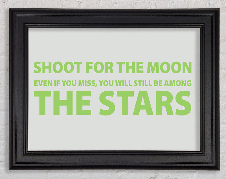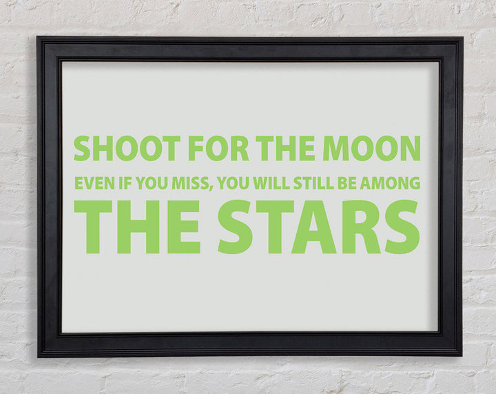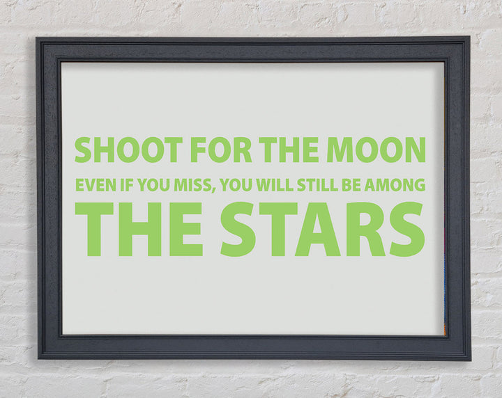 Motivierender, gerahmter Druck mit Zitat „Shoot For The Moon“ in Limettengrün, erhältlich in mehreren Rahmenfarben. Fertig zum Aufhängen aus der Schachtel und handgefertigt im Vereinigten Königreich.