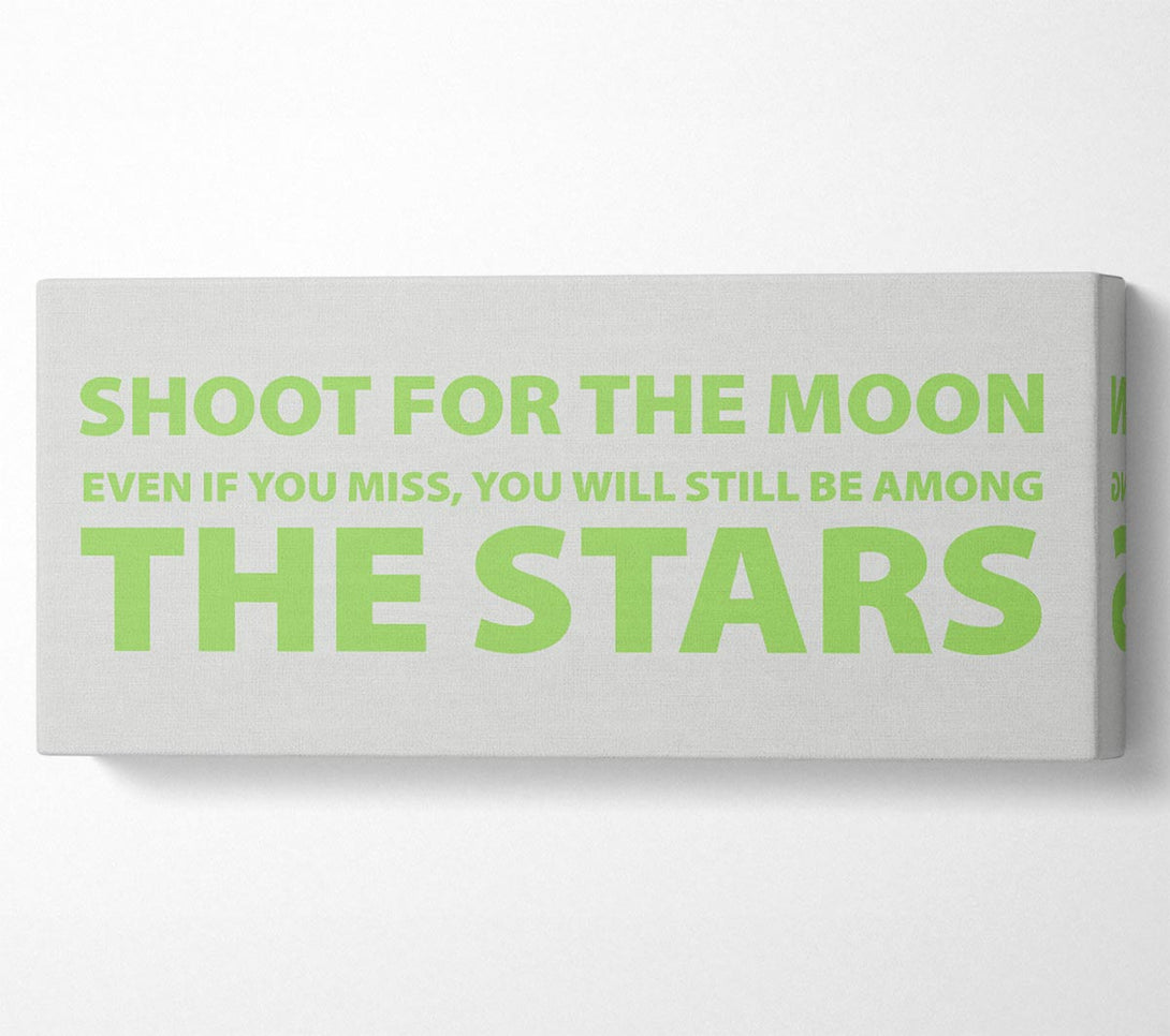 Motivierendes Zitat „Shoot For The Moon“ auf limettengrüner Leinwand, gedruckt auf beschichteter Polyester-Leinwand. Auf einem 44 mm großen Kastenrahmen montiert, fertig zum Aufhängen.