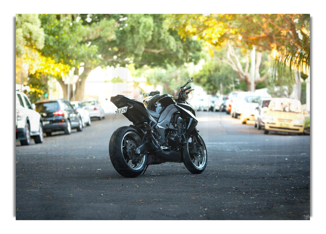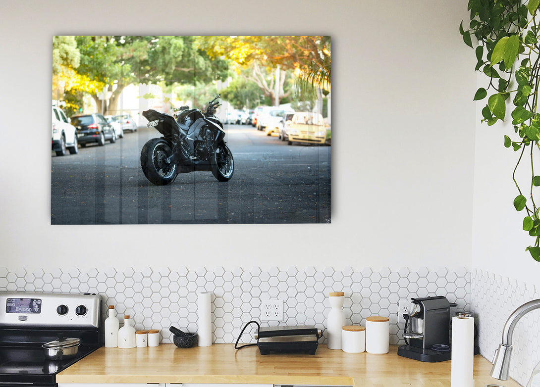 Acryldruck „Motorrad auf der Straße“, UV-gedruckt auf 5 mm dickes Acrylglas. Wird mit allem geliefert, was Sie zum Aufhängen an die Wand brauchen.