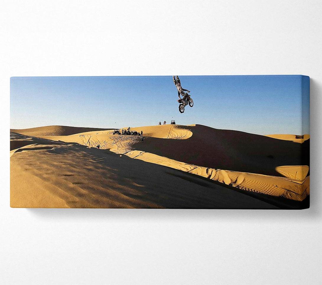 Motorcross Desert Race Jump-Leinwand, gedruckt auf beschichteter Polyester-Leinwand. Auf einem 44 mm großen Kastenrahmen montiert, fertig zum Aufhängen.