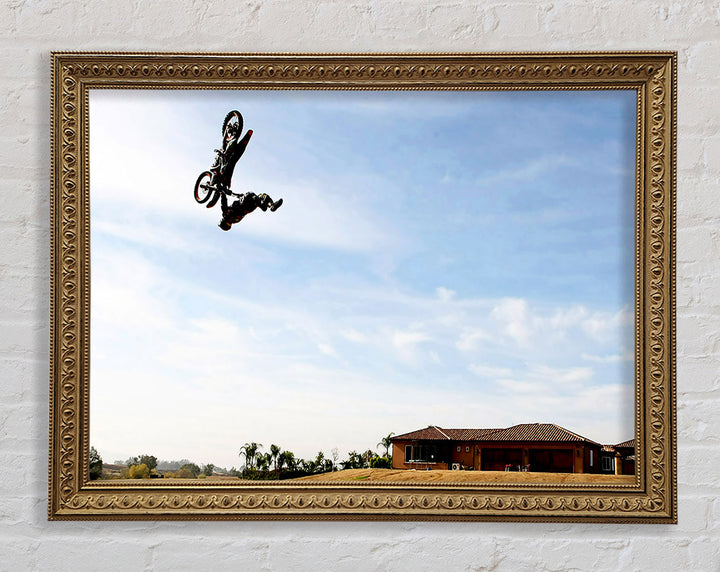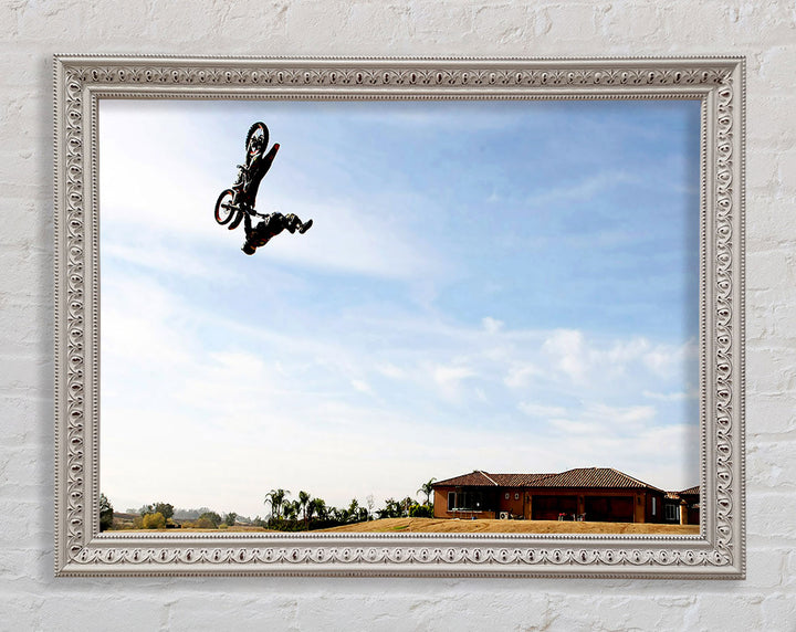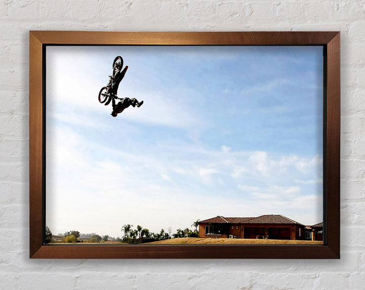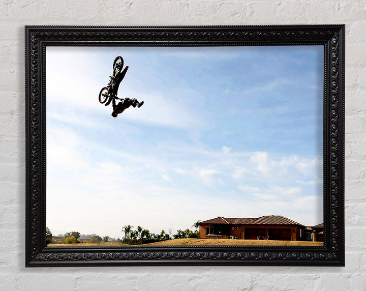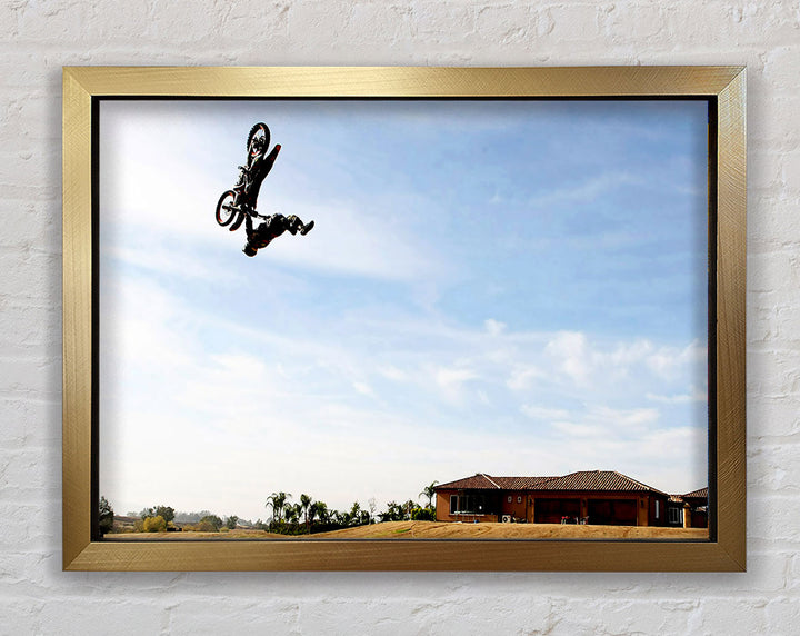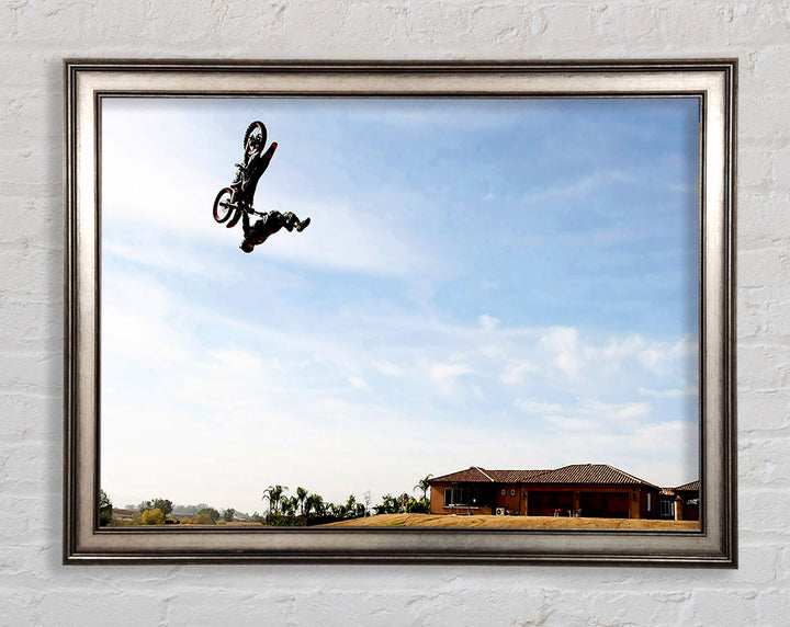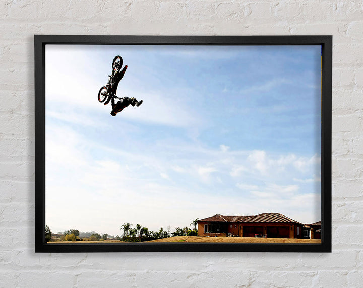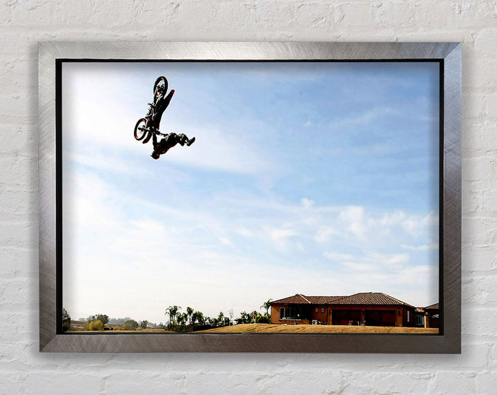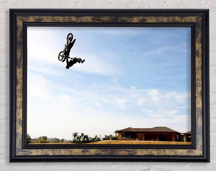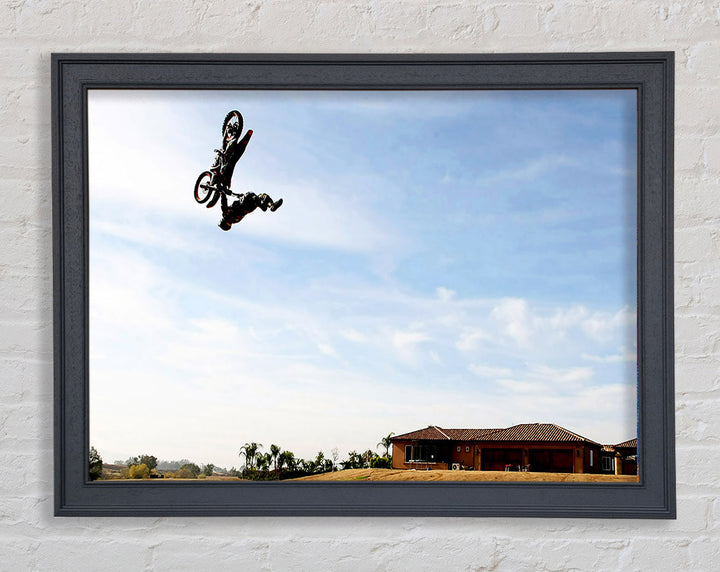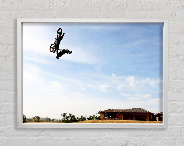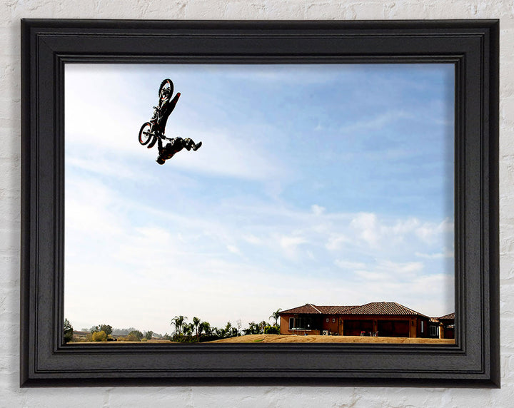 Gerahmter Druck „Motorcross In The Air“, erhältlich in mehreren Rahmenfarben. Fertig zum Aufhängen aus der Schachtel und handgefertigt im Vereinigten Königreich.