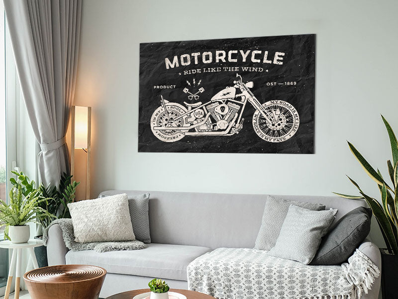 Motorradfahrt wie der Wind. Gedruckt auf gebürstetem Aluminium-Dibond. Eine moderne Art, Kunst zu präsentieren und leicht zu pflegen.