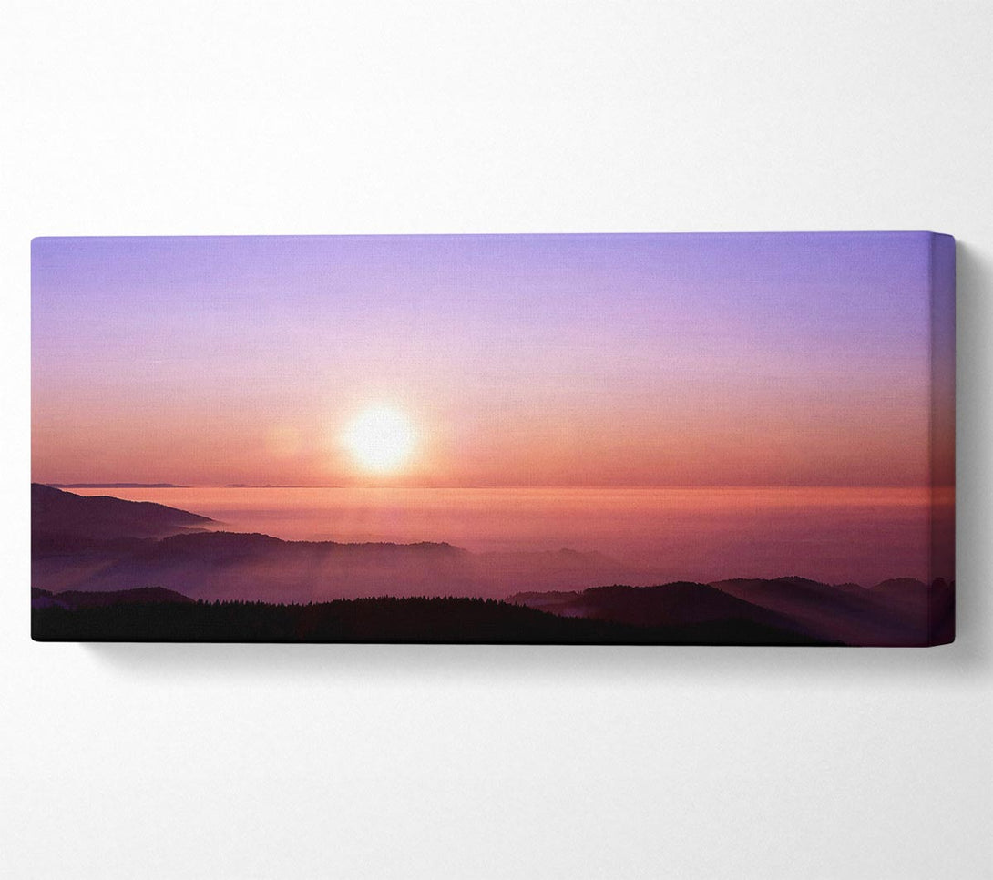 Leinwandbild „Mountain Fog At Sunset“, gedruckt auf beschichteter Polyester-Leinwand. Auf einem 44 mm großen Kastenrahmen montiert, fertig zum Aufhängen.