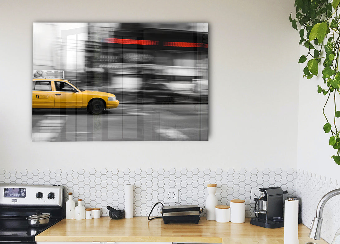 Acryldruck „Movement Of The Yellow Cab“, UV-gedruckt auf 5 mm dickes Acrylglas. Wird mit allem geliefert, was Sie zum Aufhängen an die Wand brauchen.