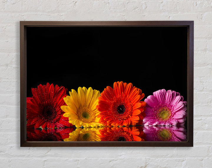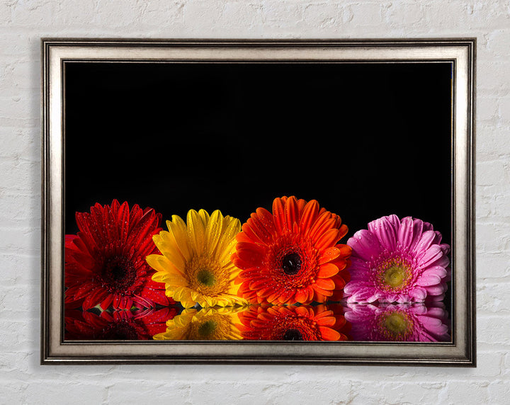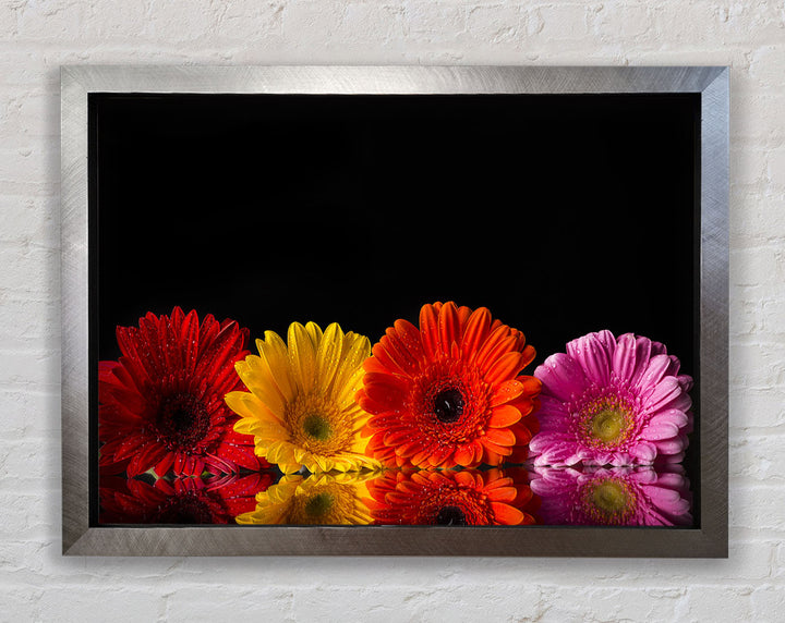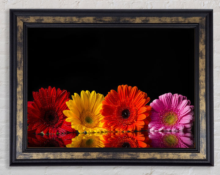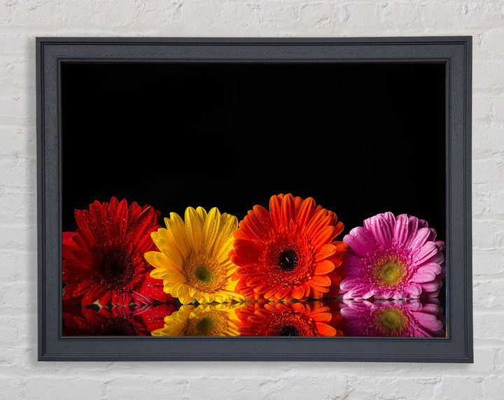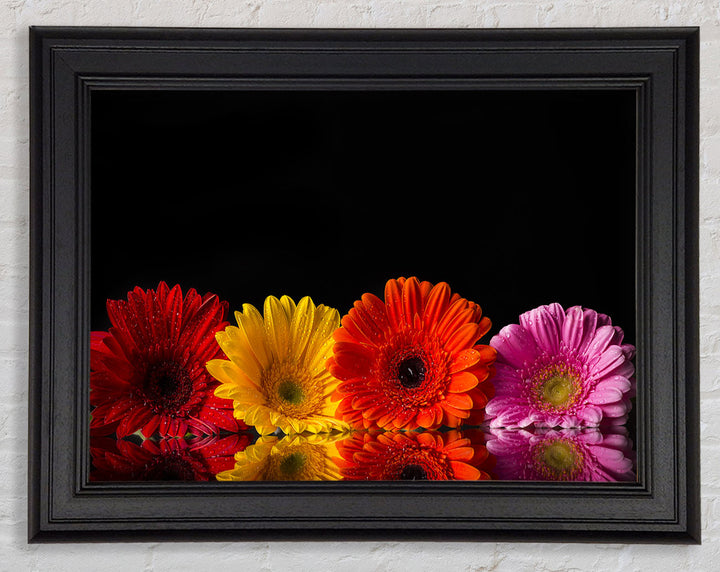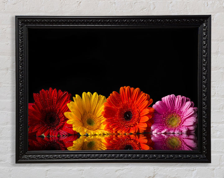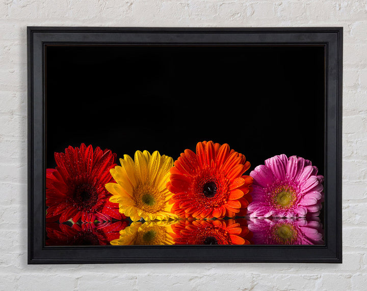 Mehrfarbiger gerahmter Druck mit Gerbera, erhältlich in mehreren Rahmenfarben. Fertig zum Aufhängen aus der Schachtel und handgefertigt im Vereinigten Königreich.