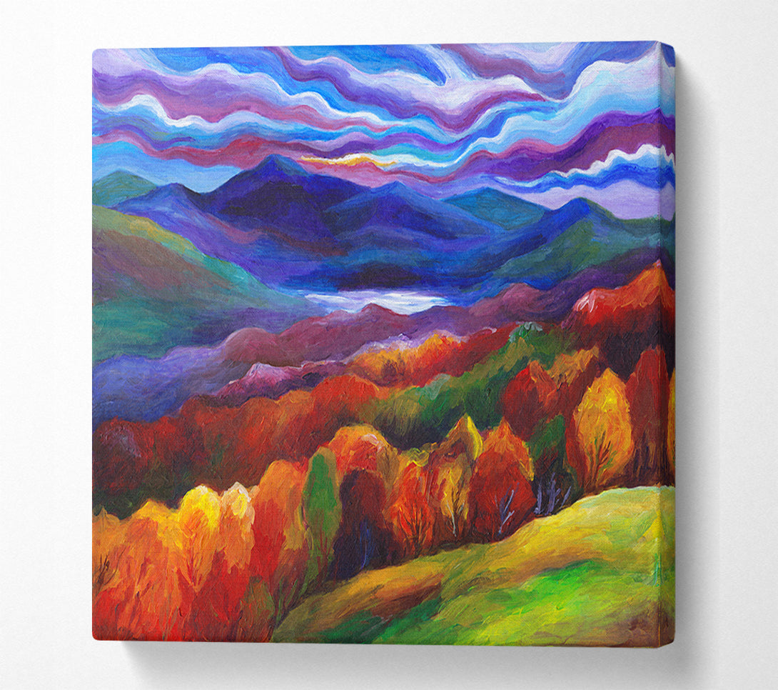 Mehrfarbige Leinwand mit dem Motiv „Berge“, gedruckt auf beschichteter Polyester-Leinwand. Auf einem 44 mm breiten Kastenrahmen montiert, fertig zum Aufhängen.