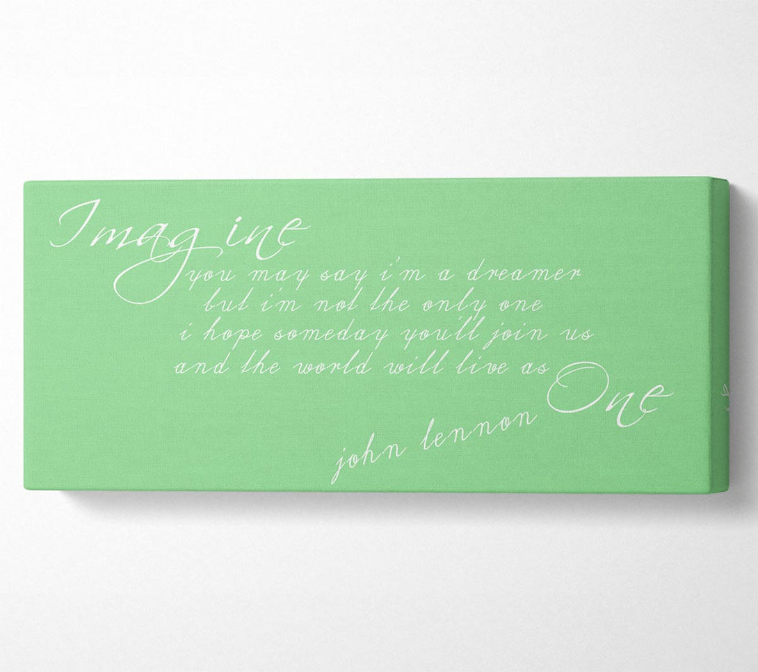 Musikzitat „Imagine“ von John Lennon auf grüner Leinwand, gedruckt auf beschichteter Polyester-Leinwand. Auf einem 44 mm großen Kastenrahmen montiert, fertig zum Aufhängen.