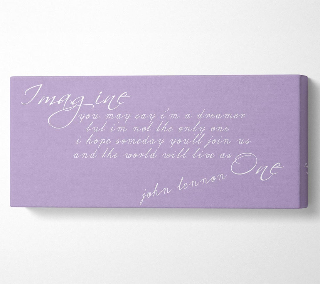 Musikzitat „Imagine“ von John Lennon in Lila, gedruckt auf beschichteter Polyester-Leinwand. Auf einem 44 mm großen Kastenrahmen montiert, fertig zum Aufhängen.