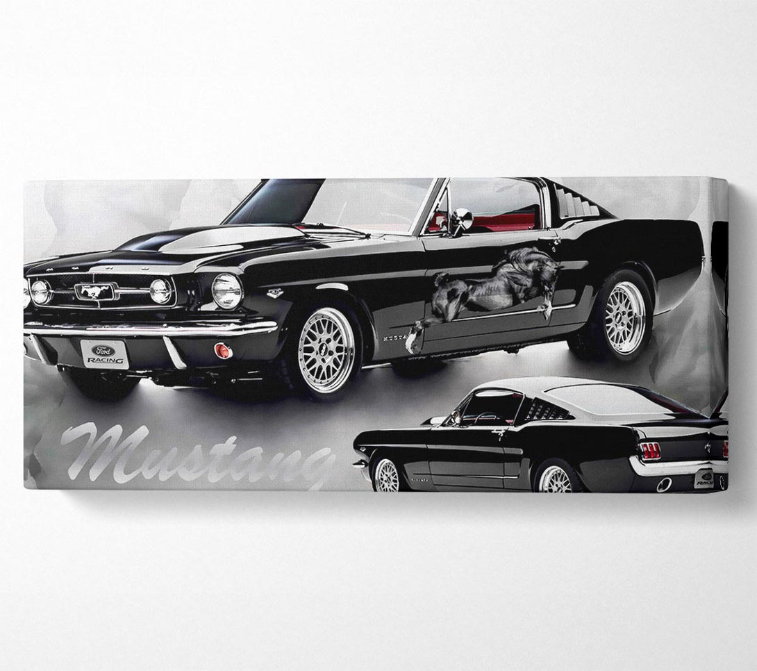 Mustang 65 Schwarze Leinwand, gedruckt auf beschichteter Polyester-Leinwand. Auf einem 44 mm großen Kastenrahmen montiert, fertig zum Aufhängen.