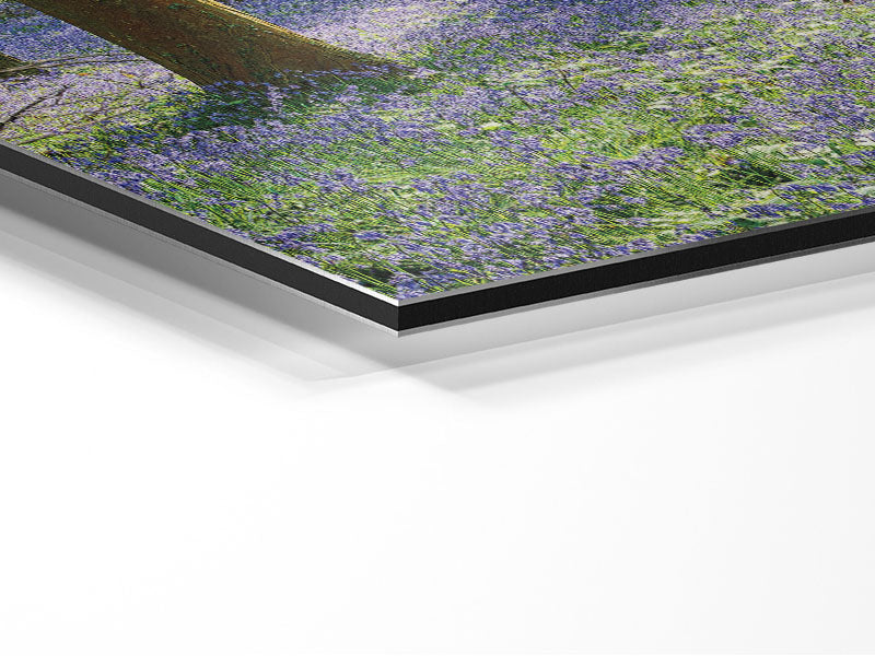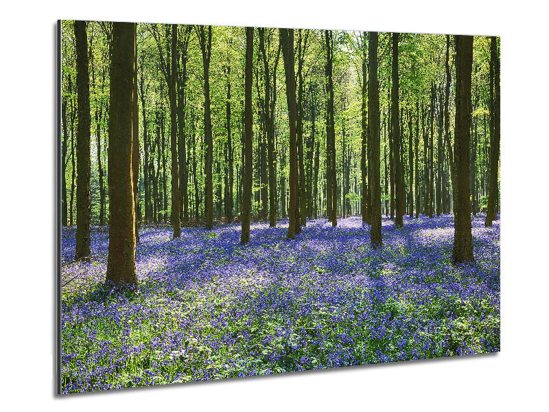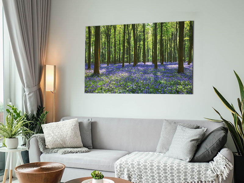 Mystisches Waldland mit Glockenblumen. Gedruckt auf gebürstetem Aluminium-Dibond. Eine moderne Art, Kunst zu präsentieren und leicht zu pflegen.