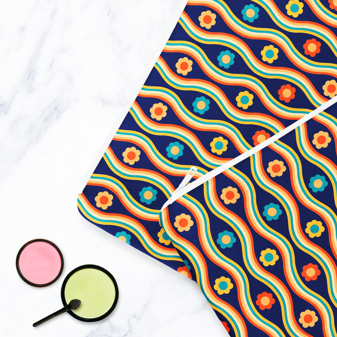 This is a cosmetic bag that I have made using a navy blue retro fabric. The fabric and the bag are designed and handmade by Shadowbright. The bag is lined with a water resistant coated cotton.