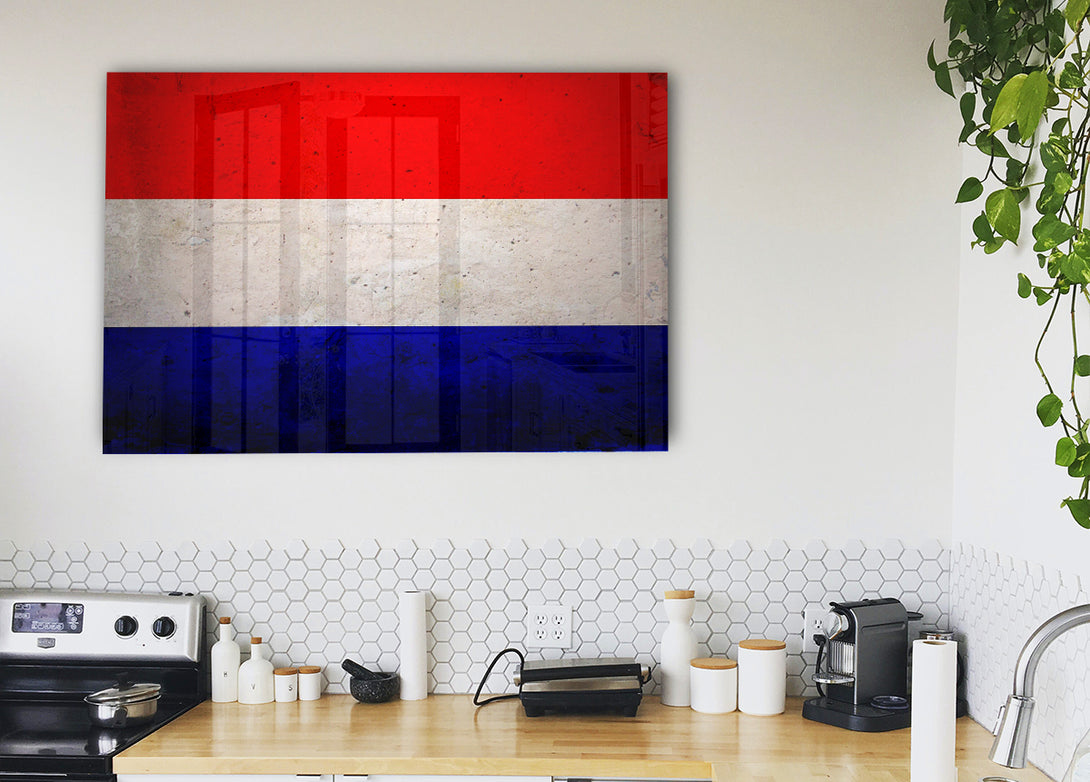 Acryldruck mit niederländischer Flagge, UV-Druck auf 5 mm dickes Acrylglas. Wird mit allem geliefert, was Sie zum Aufhängen an die Wand benötigen.