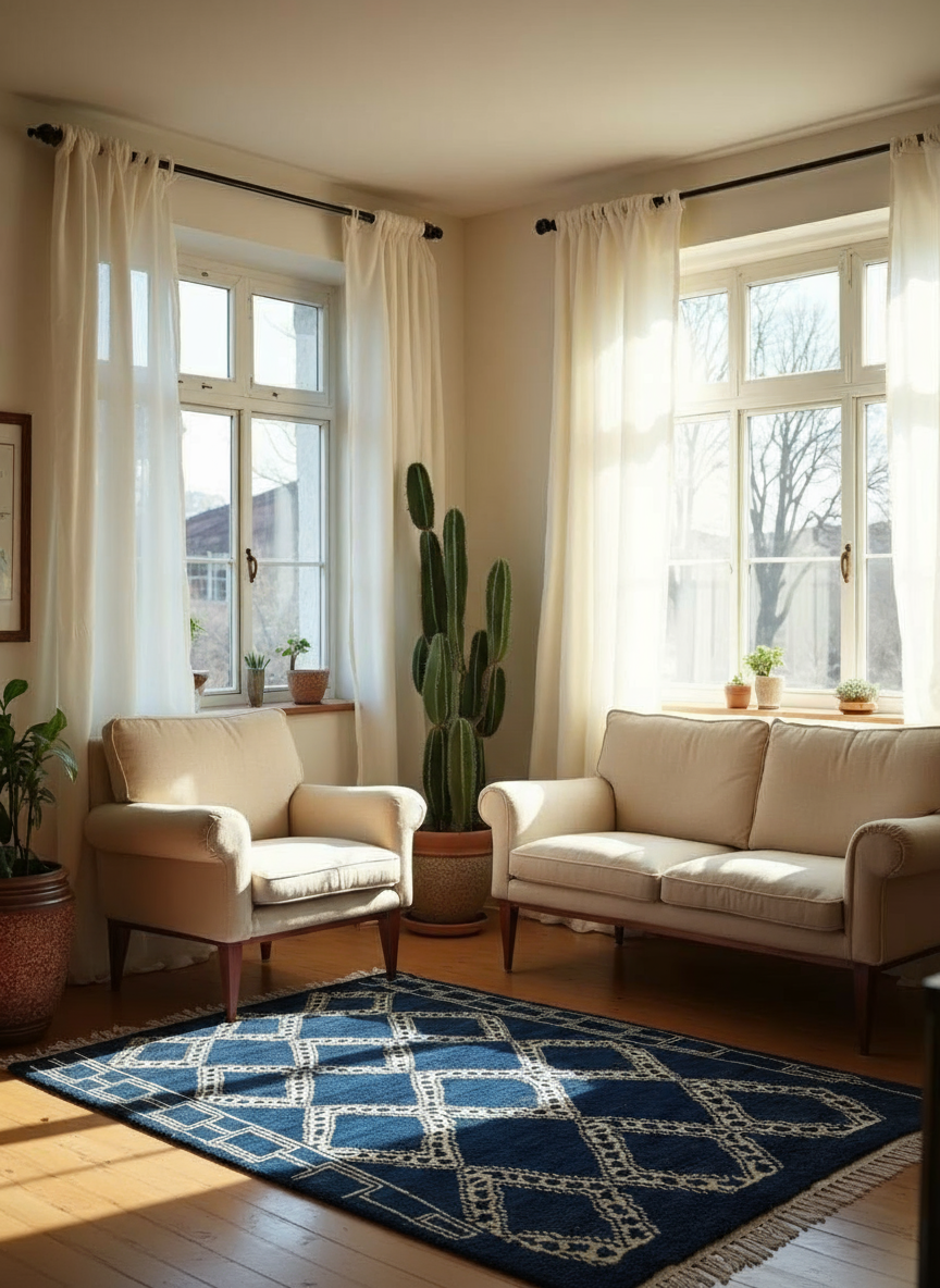Hand-knotted by expert artisans, the Nomad Rug has a cool blue foundation and is made of high wool quality. The soft pile, which was inspired by the texture of Moroccan rugs, gives your floor a plush feel that is warm and inviting underfoot. The blue colour and white geometric designs in your carpet also give your living area an air of elegance and tranquilly.