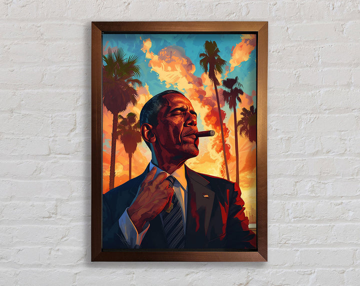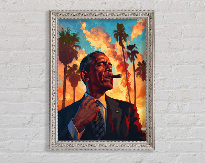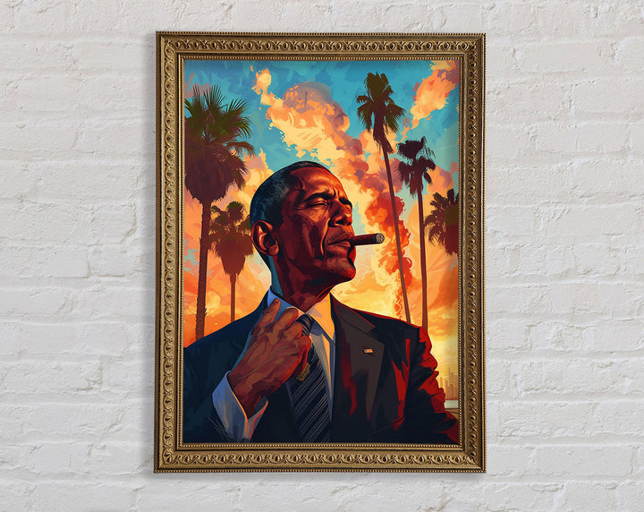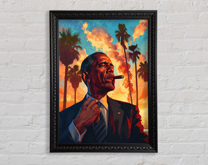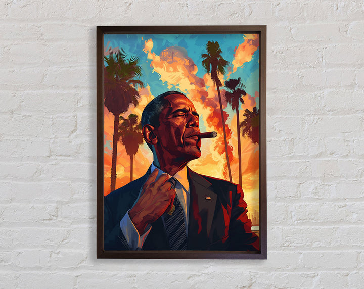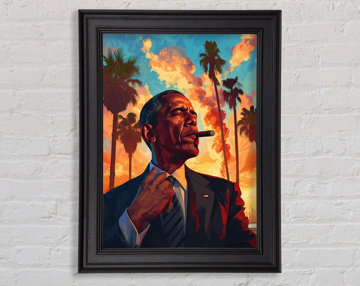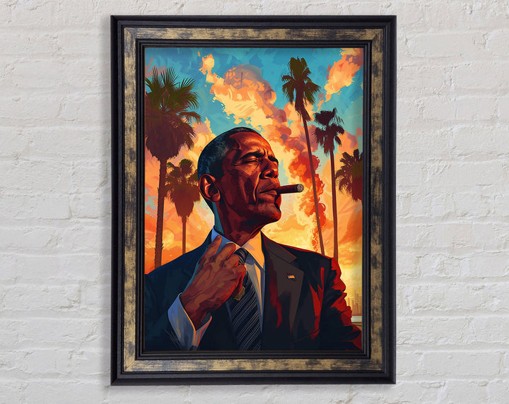 Introducing the Obama Cigar Framed Print, a stunning piece of framed art that captures the essence of sophistication and style. This unique artwork features a classic image of President Obama enjoying a cigar, making it a perfect addition to any room. Available in six sizes, from small to oversized, this print can fit any space you have in mind. Choose from a variety of colors to match your decor seamlessly. Each piece is handmade in the United Kingdom, ensuring exceptional quality and craftsmanship. Ready to hang, this framed print is an effortless way to elevate your home or office with elegance and historical significance.