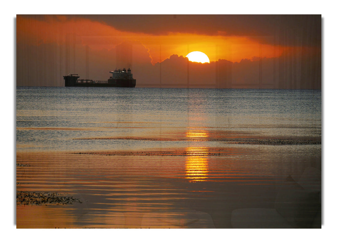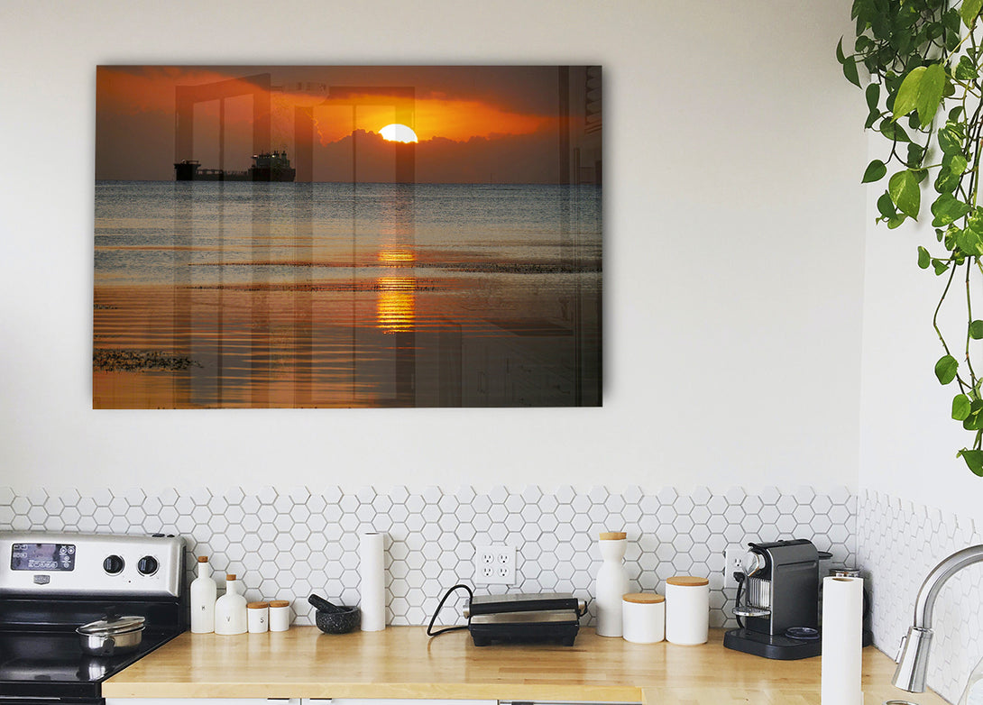 Acryldruck „Ocean Ship Sun Glow“, UV-gedruckt auf 5 mm dickes Acrylglas. Wird mit allem geliefert, was Sie zum Aufhängen an die Wand brauchen.