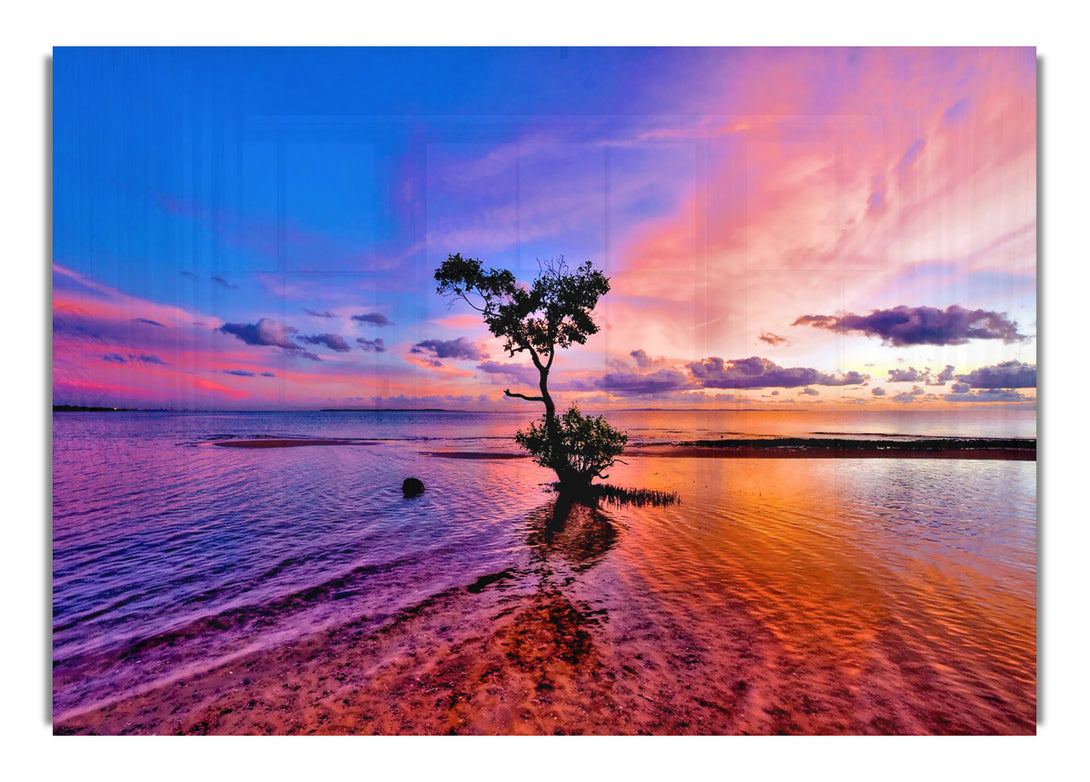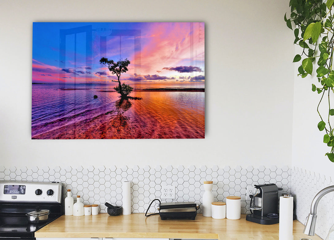 Acryldruck „Ocean Tree Dusk“, UV-gedruckt auf 5 mm dickes Acrylglas. Wird mit allem geliefert, was Sie zum Aufhängen an die Wand brauchen.