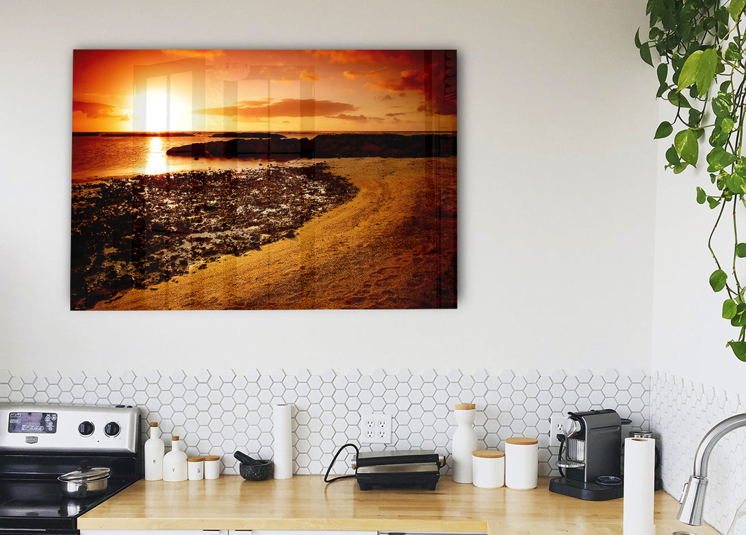 Ockerfarbener Acryldruck „Ocean Sunset“, UV-gedruckt auf 5 mm dickes Acrylglas. Wird mit allem geliefert, was Sie zum Aufhängen an die Wand benötigen.