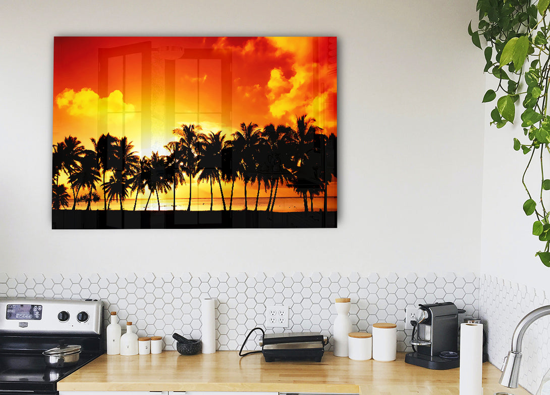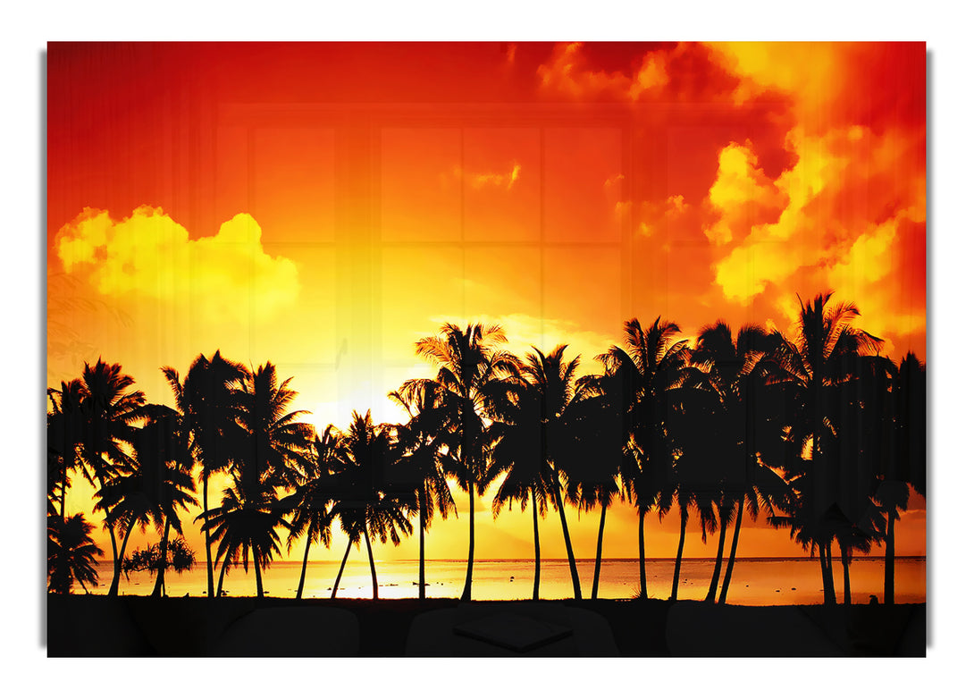 Acryldruck „Orange Palm Tree Sunset“, UV-gedruckt auf 5 mm dickes Acrylglas. Wird mit allem geliefert, was Sie zum Aufhängen an die Wand brauchen.