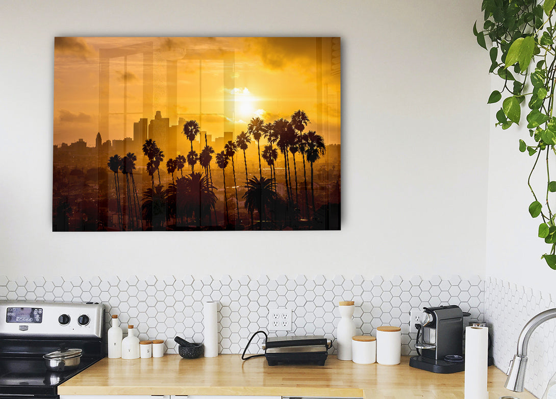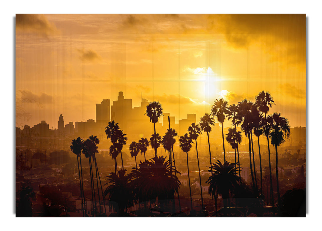 Acryldruck „Palm Tree City“, UV-gedruckt auf 5 mm dickes Acrylglas. Wird mit allem geliefert, was Sie zum Aufhängen an die Wand brauchen.