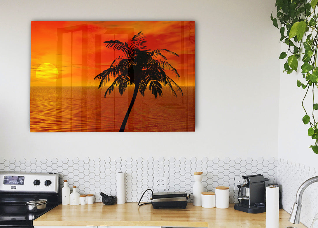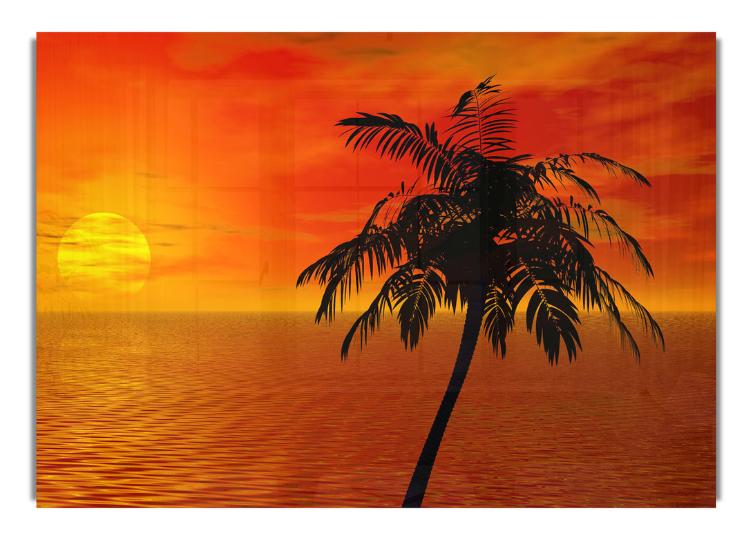 Acryldruck „Palme, Ozean, Sonne“, UV-Druck auf 5 mm dickes Acrylglas. Wird mit allem geliefert, was Sie zum Aufhängen an die Wand benötigen.