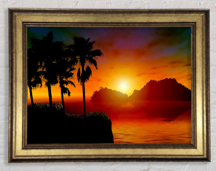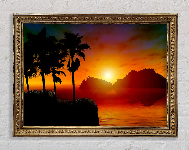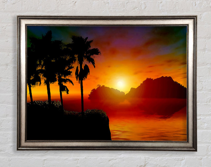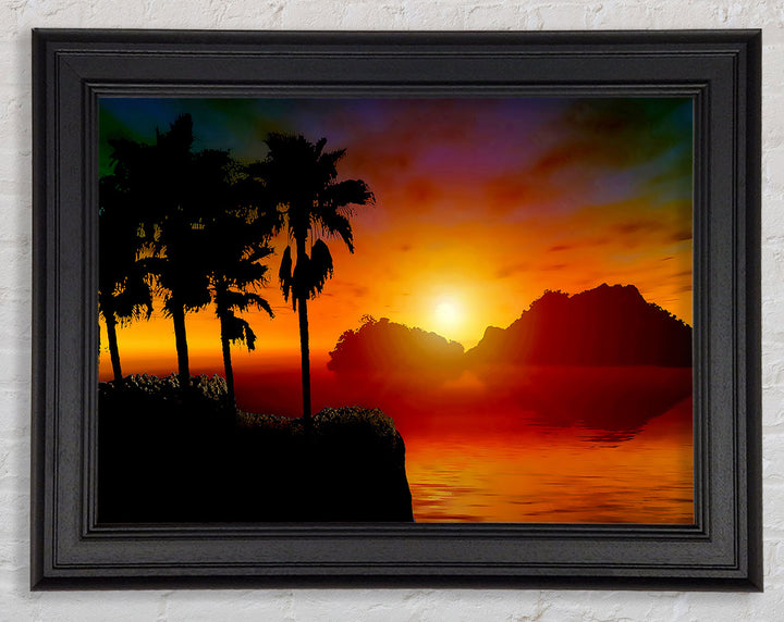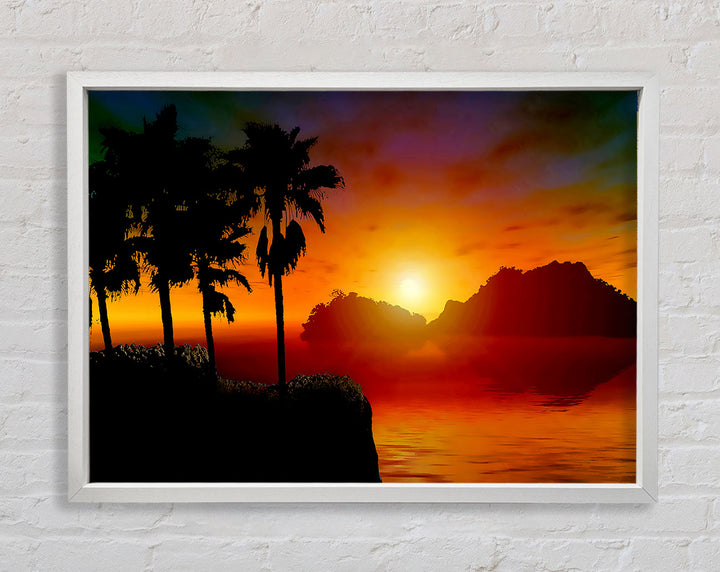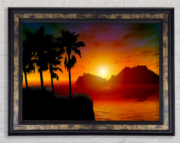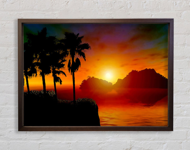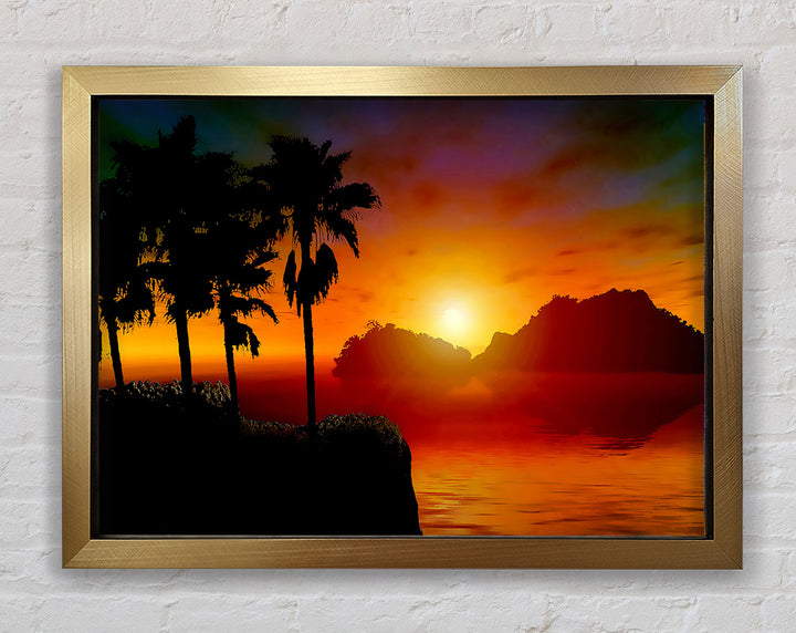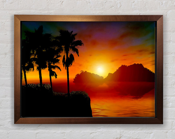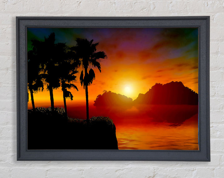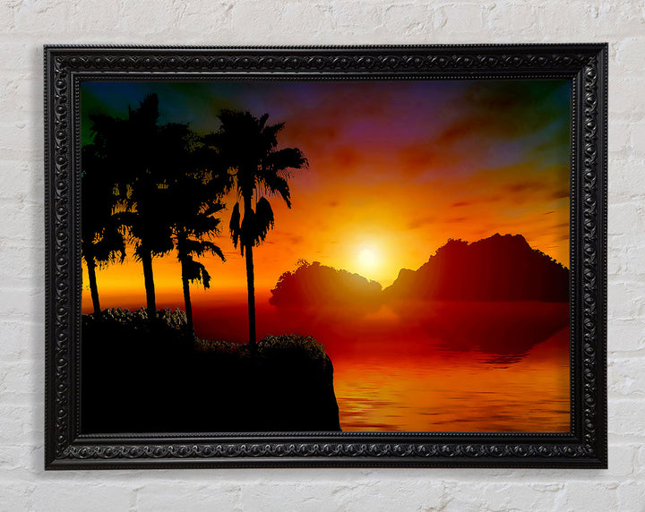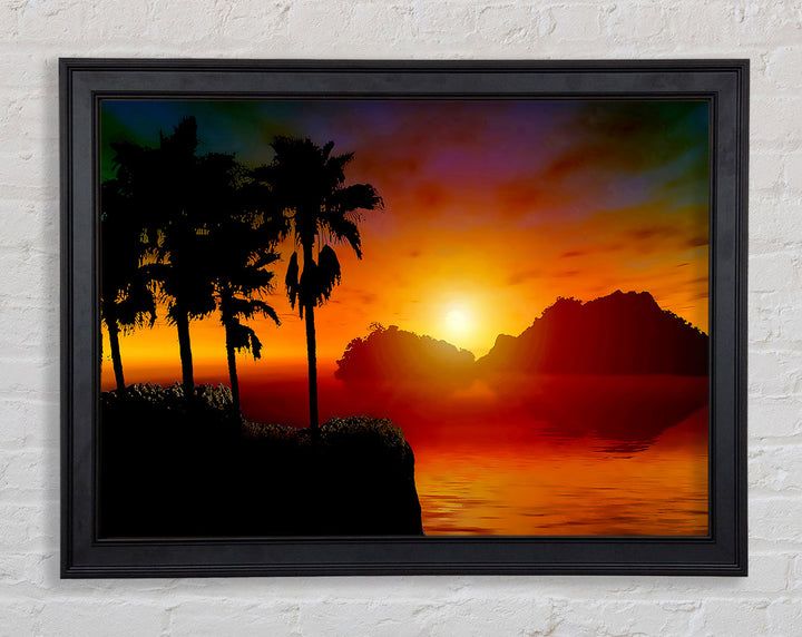 Gerahmter Druck „Palme Orange Sun“, erhältlich in mehreren Rahmenfarben. Fertig zum Aufhängen aus der Schachtel und handgefertigt im Vereinigten Königreich.
