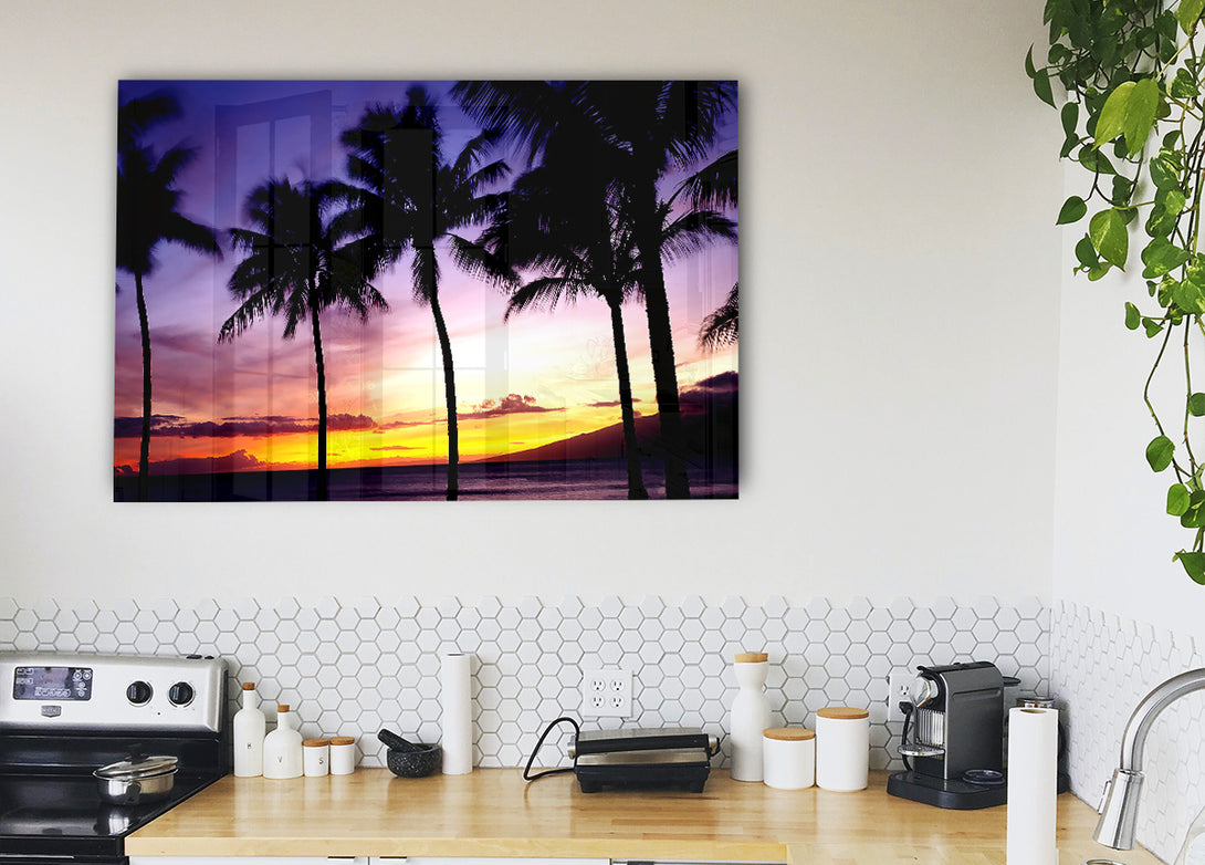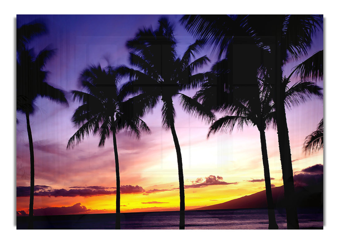 Acryldruck „Palmen-Sonnenuntergang“, UV-gedruckt auf 5 mm dickes Acrylglas. Wird mit allem geliefert, was Sie zum Aufhängen an die Wand brauchen.