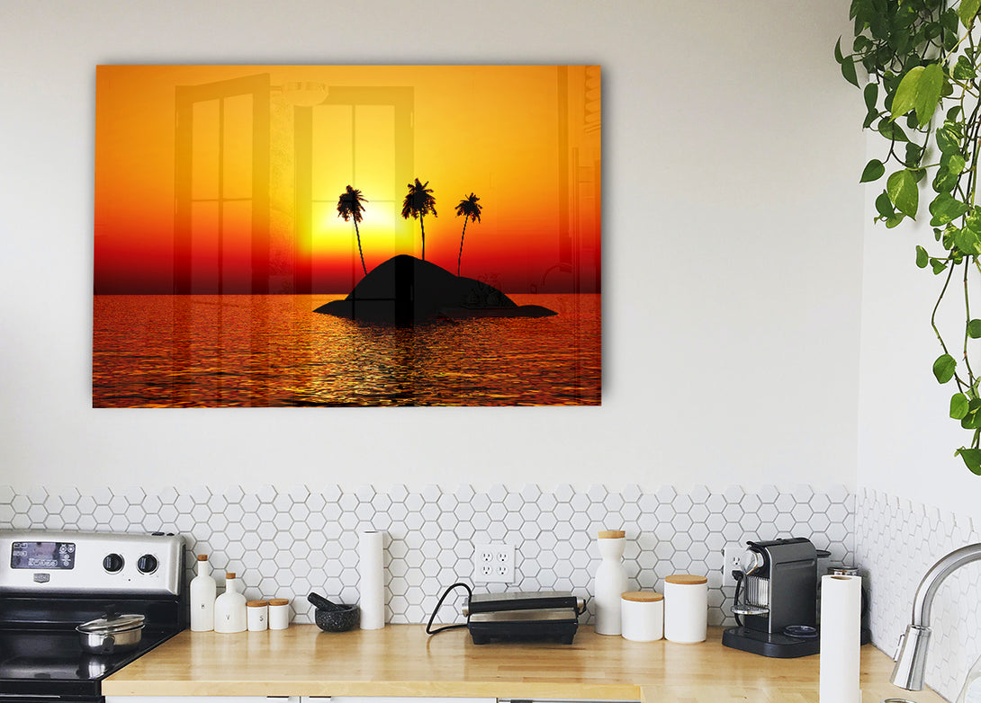 Acryldruck „Palmtree Island At Sunset“, UV-gedruckt auf 5 mm dickes Acrylglas. Wird mit allem geliefert, was Sie zum Aufhängen an die Wand brauchen.