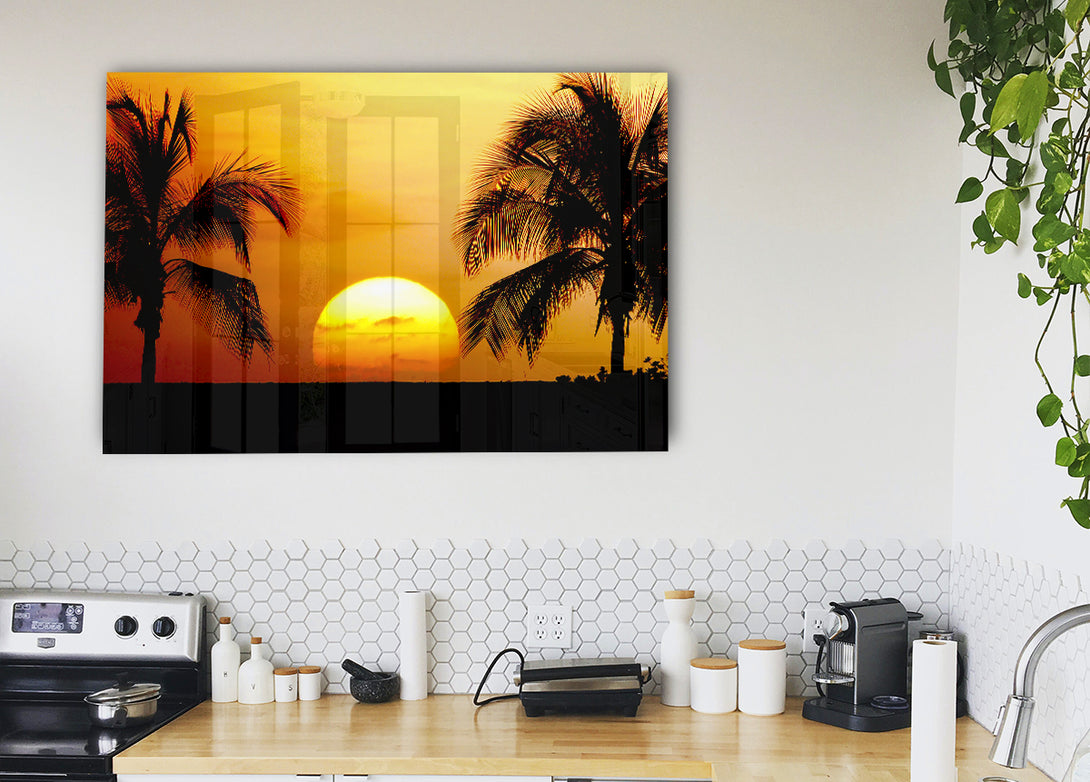 Acryldruck „Palmen-Sonnenuntergang“, UV-gedruckt auf 5 mm dickes Acrylglas. Wird mit allem geliefert, was Sie zum Aufhängen an die Wand brauchen.
