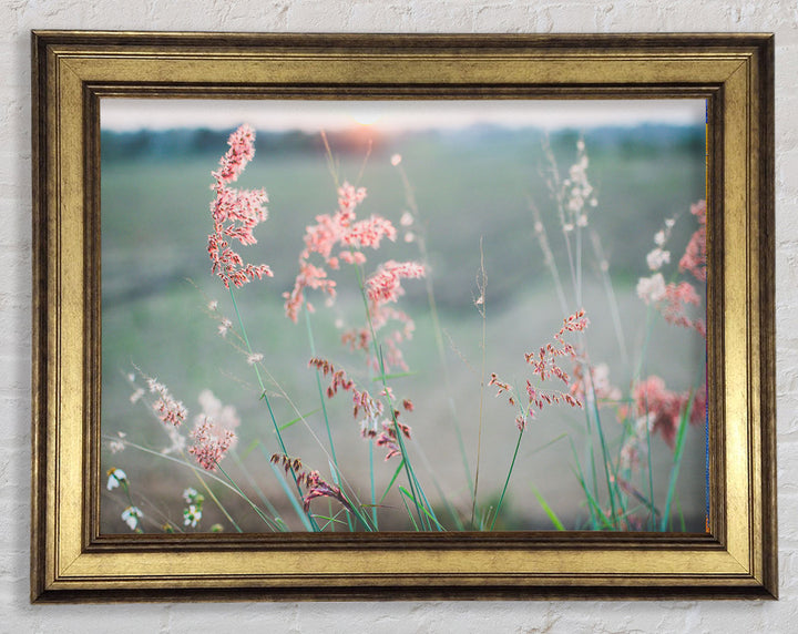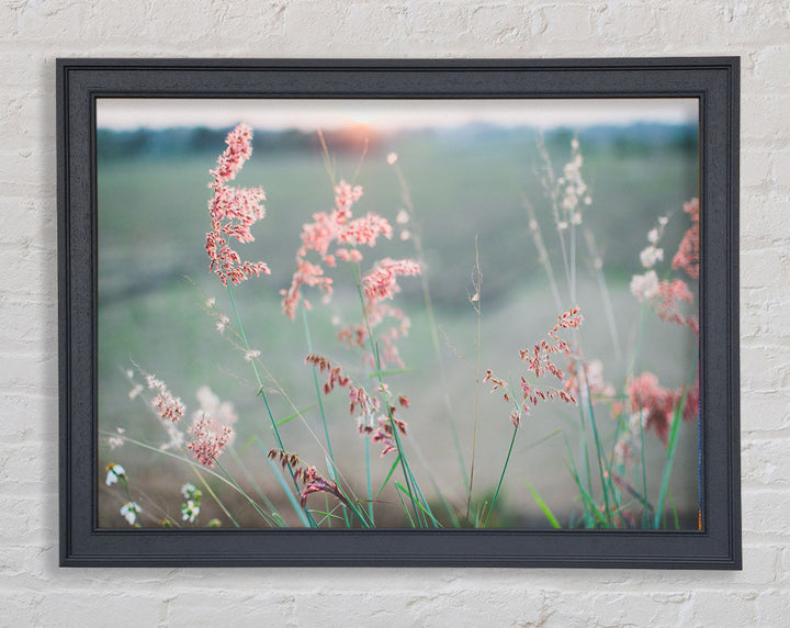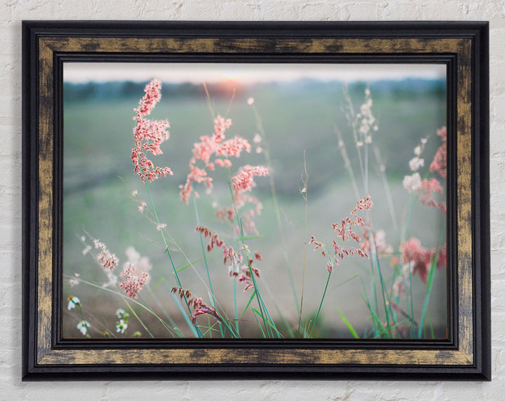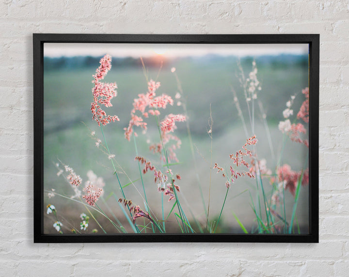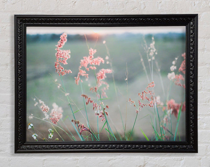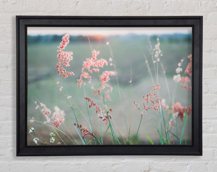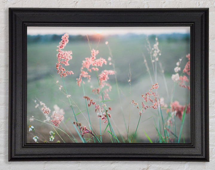 Gerahmter Druck „Pfirsichfarbene Blumen auf der Morgenwiese“, erhältlich in mehreren Rahmenfarben. Fertig zum Aufhängen aus der Schachtel und handgefertigt im Vereinigten Königreich.