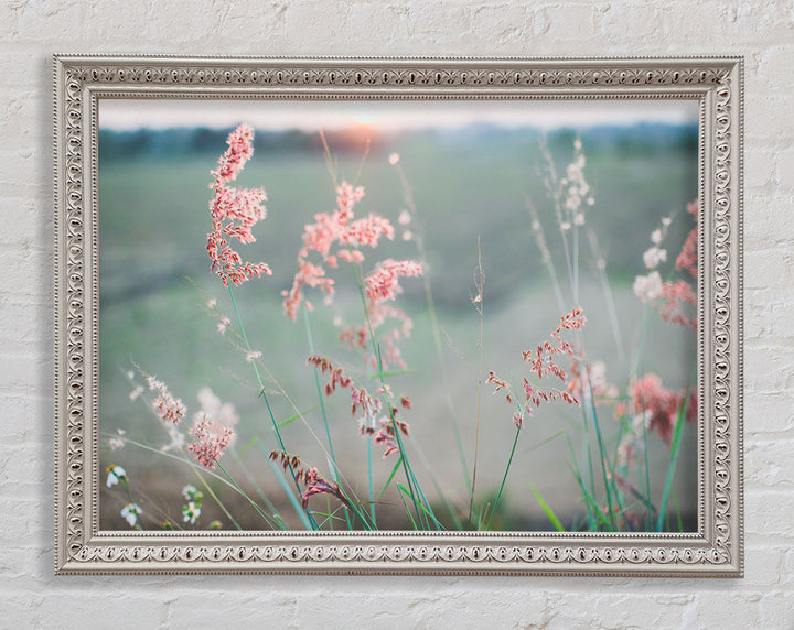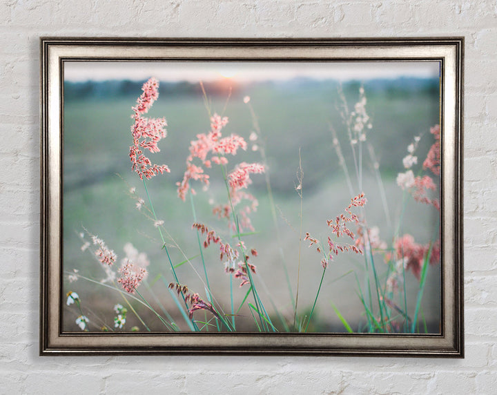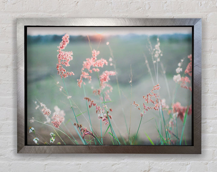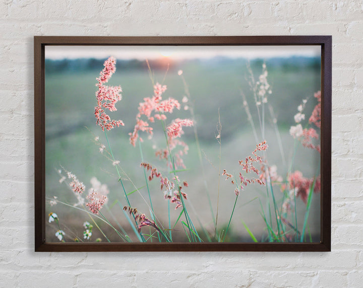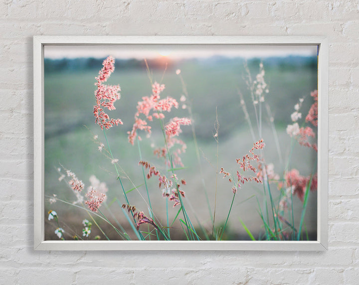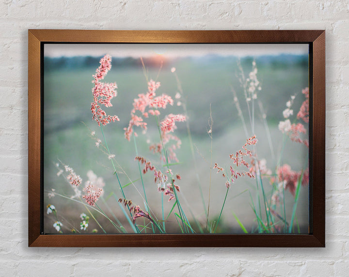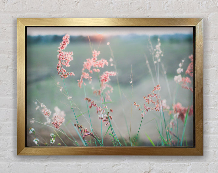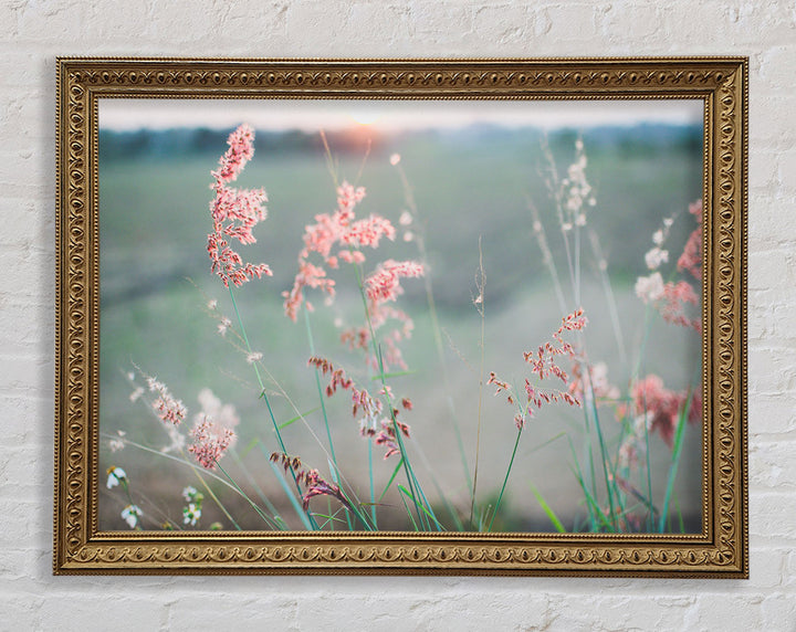 Gerahmter Druck „Pfirsichfarbene Blumen auf der Morgenwiese“, erhältlich in mehreren Rahmenfarben. Fertig zum Aufhängen aus der Schachtel und handgefertigt im Vereinigten Königreich.