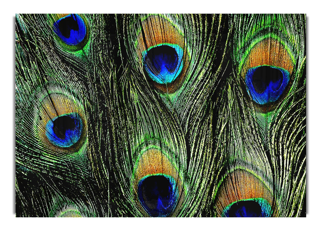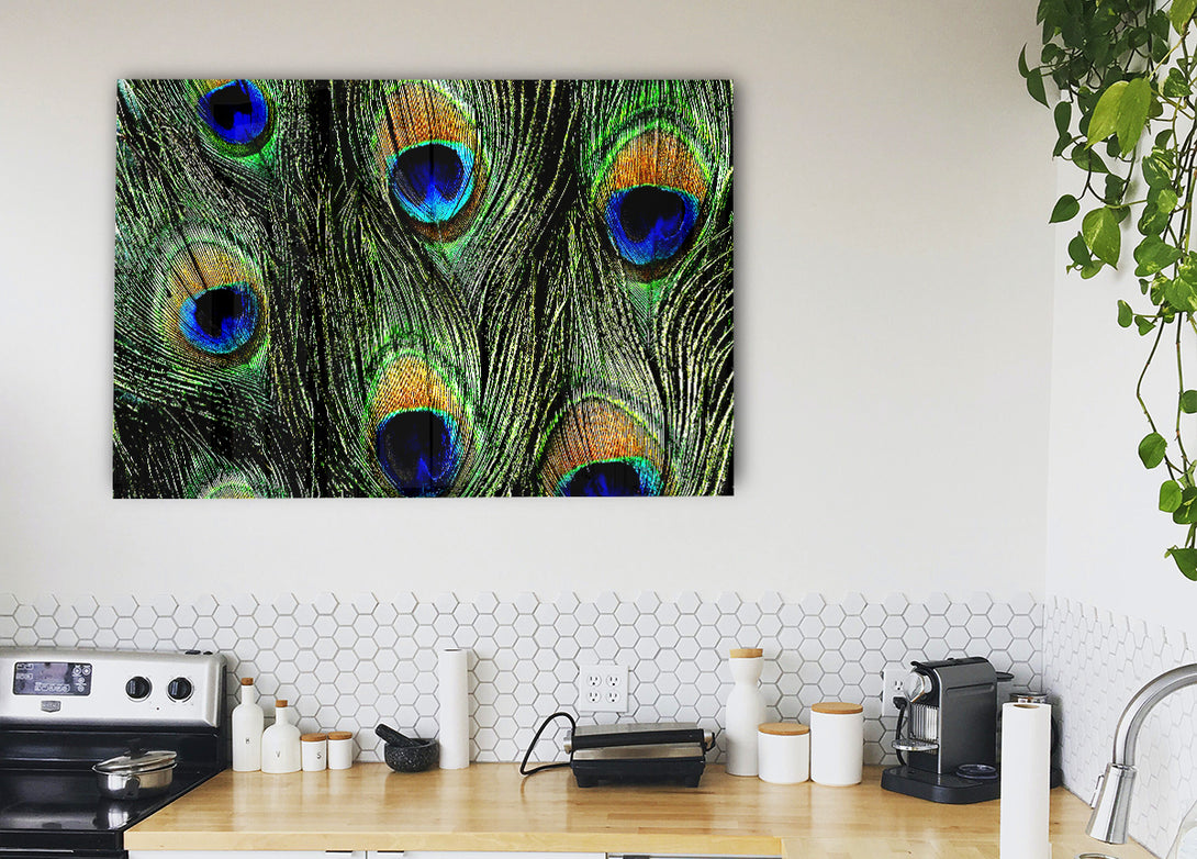 Acryldruck auf Leinwand mit Pfauenfedern und wildem Leben, UV-Druck auf 5 mm dickes Acrylglas. Wird mit allem geliefert, was Sie zum Aufhängen an die Wand brauchen.