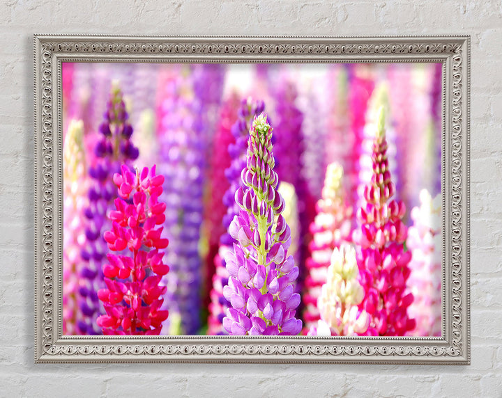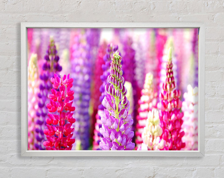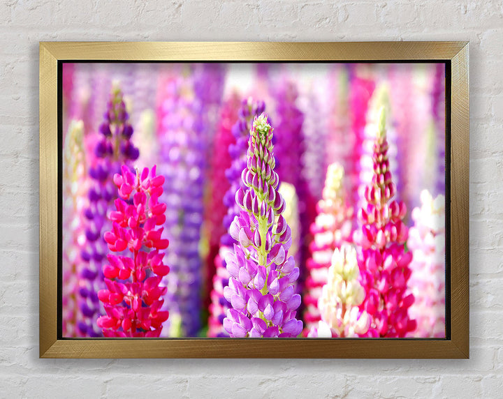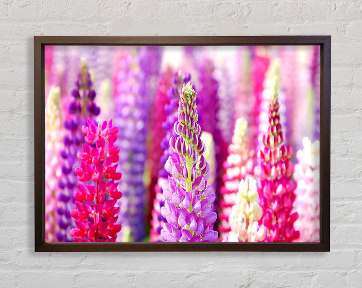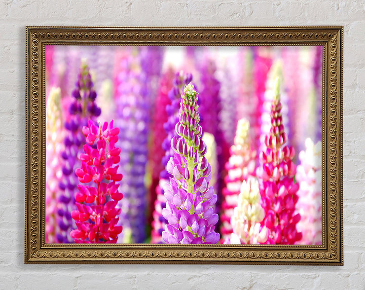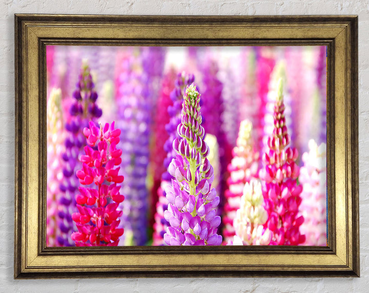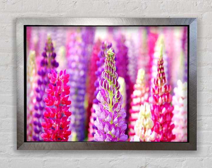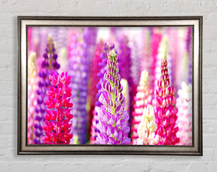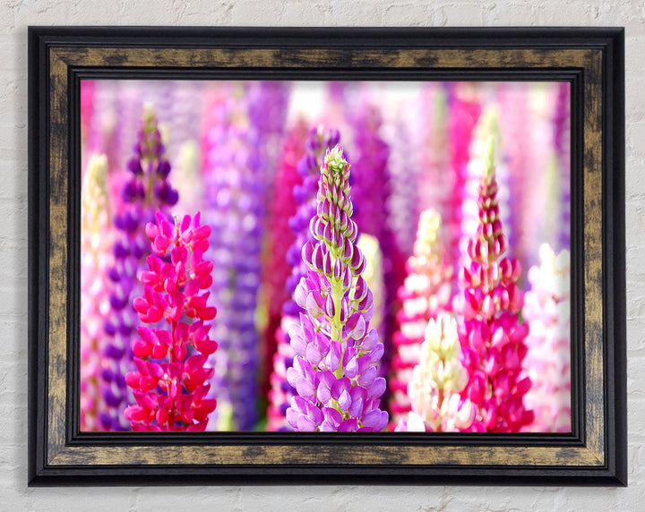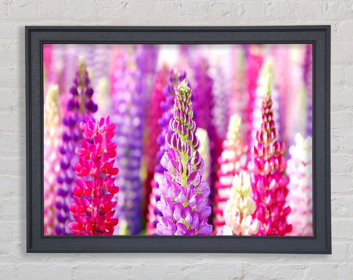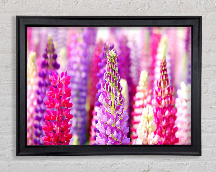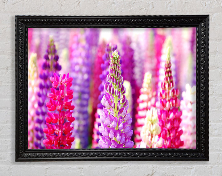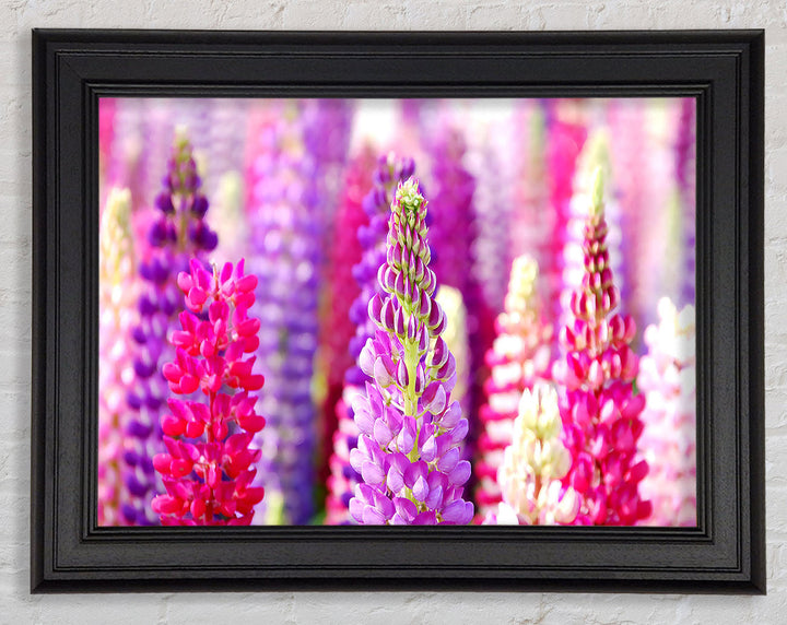 Gerahmter Druck mit rosa und violetten Lupinenblüten, erhältlich in mehreren Rahmenfarben. Fertig zum Aufhängen aus der Schachtel und handgefertigt im Vereinigten Königreich.