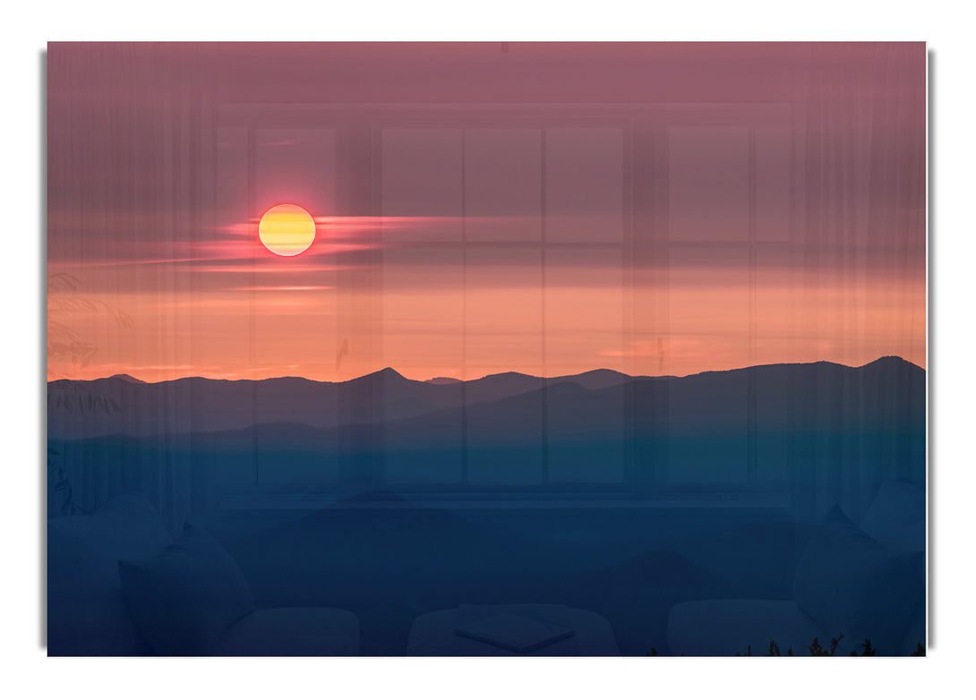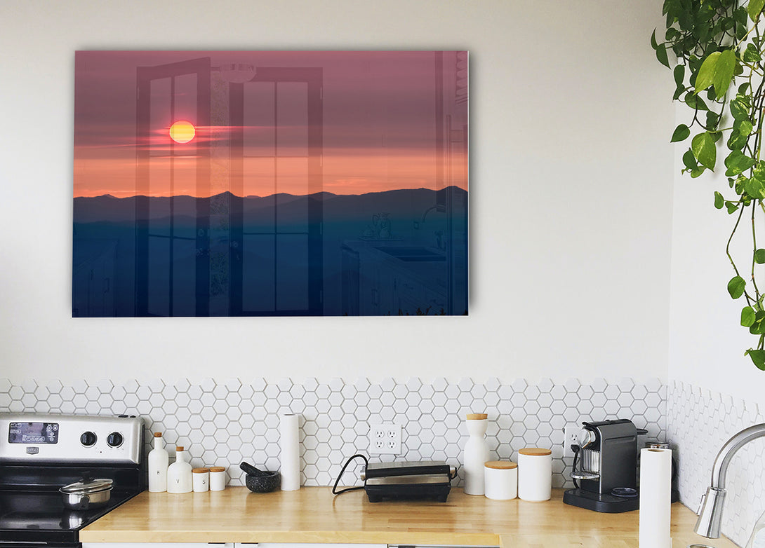 Acryldruck „Pink Tranquil Sun“, UV-gedruckt auf 5 mm dickes Acrylglas. Wird mit allem geliefert, was Sie zum Aufhängen an die Wand brauchen.